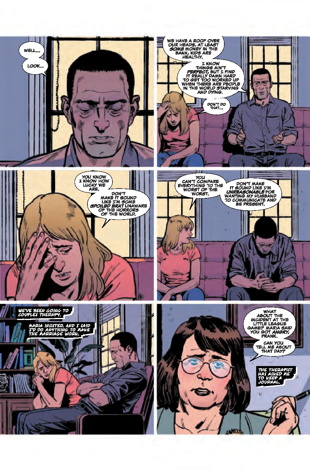 We find Frank and his wife, Maria going to couple’s therapy, years before he became the Punisher, as the therapist urges him to keep a journal, one where we see how impossible of transition it was for him to come back to normal life. As he tries his best to adjust to normal life he gets into scuffle with an abusive parent and during Halloween, have an argument with other parents, who have an opinion about war, but never served in the military. Then one night, everything changes, as he senses something wrong in at a house in his neighborhood, as he soon discovers a mobster’s house, with some sadistic individuals. By the issue’s end, an intended victim shows his wife, that the road to change would be long and winding.
