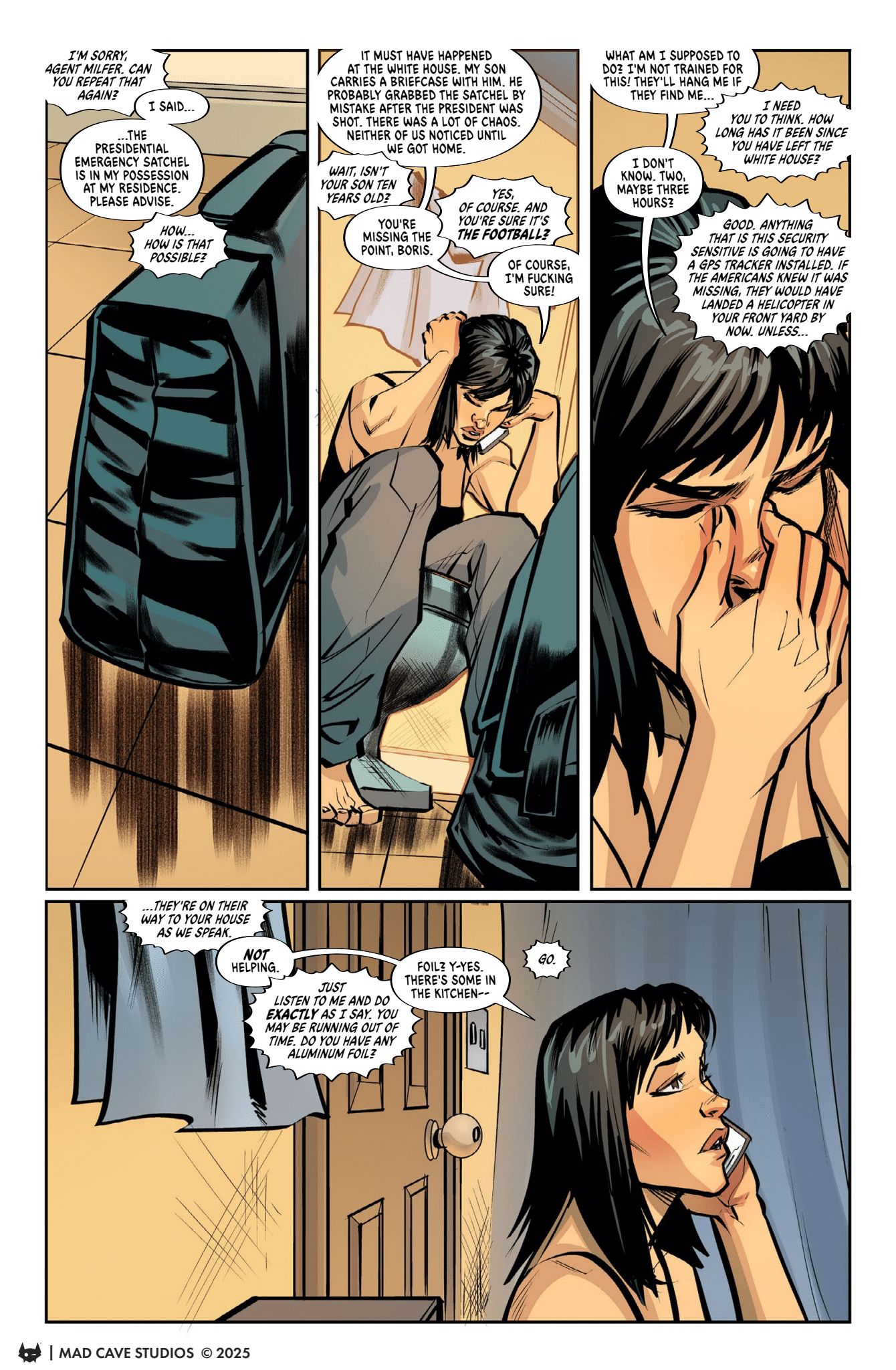Going into Don’t Forget Your Briefcase #1 I expected a straightforward thriller about the nuclear football winding up in the wrong hands. It’s a concept we’ve seen many times before where someone winds up with a bag that looked like theirs but wasn’t. Then, it puts them in danger as the original owner(s), usually bad people, try to get it back. But, this debut written by Eliot Rahal surprised me as so much more in many ways.