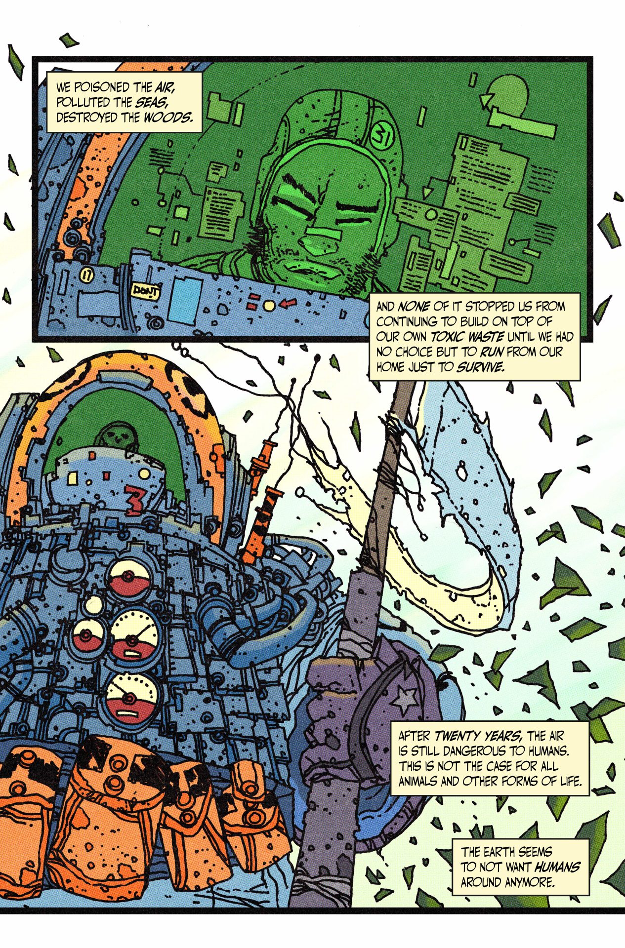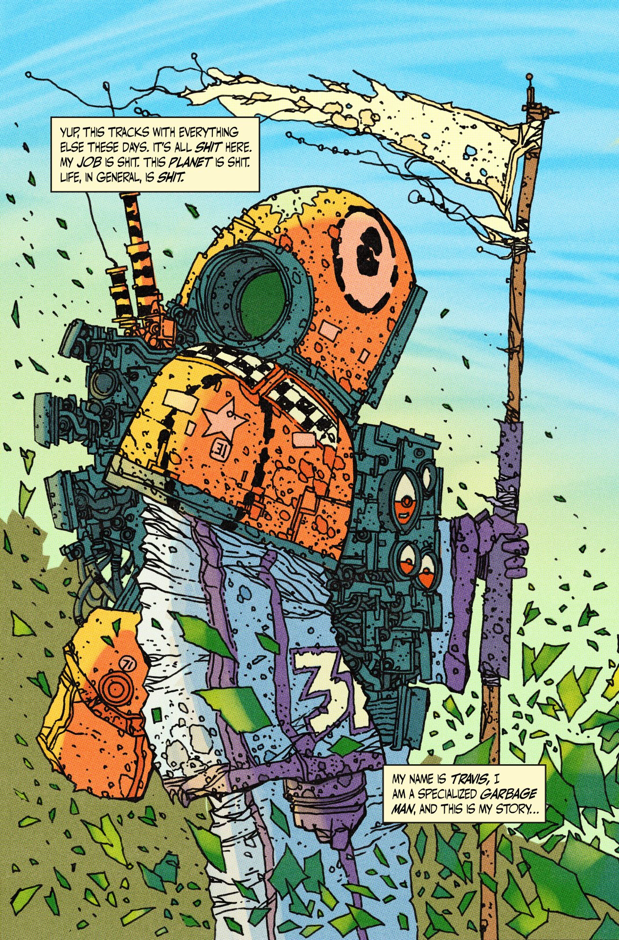 One man’s trash is another man’s living. Since earth became inhospitable, humanity escaped ages ago to live in a space station floating above the atmosphere. Now Travis and his crew of garbage men are tasked with cleaning up mountains of toxic waste, working for a company called Atomic Bros INC., to create a “Clear World.” But when one of Travis’ crew members goes missing near an old nuclear facility Travis’ job becomes a bit more complicated.