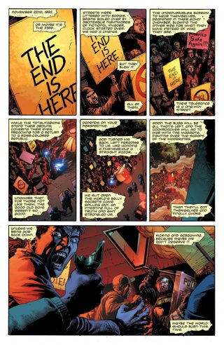 To put it bluntly, Doomsday Clock #1 is what many comic book fans (And Alan Moore wherever he is.) have feared: a direct sequel to Watchmen. The story is set in an alternate version of 1992 about five years after the events of the original series. An actor (Robert Redford) is president, the world is on the brink of nuclear war, Ozymandias is a fugitive and pariah, Dr. Manhattan is missing, Nite Owl and Silk Spectre are still happily retired and don’t appeared, and the book focuses on the new Rorschach in town. With the exception of the final scene, Doomsday Clock #1 isn’t so much a crossover, but Watchmen II. It takes its times and gives readers a flavor of Moore and Dave Gibbons’ even more dystopian universe and kicks the plot into gear in a way similar to the back half of the original series than the initial investigation into the Comedian’s death. (Edward Blake would probably appreciate the opening riot scene though.)
