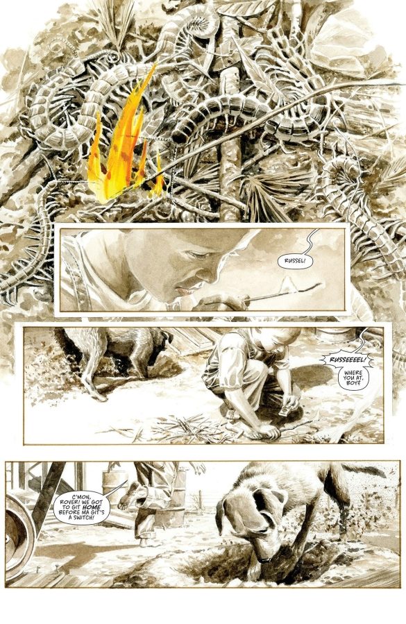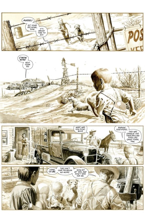 Written by JG Jones and Phil Bram, Dust to Dust #3 is another excellent issue that’s haunting in so many ways. The story is a murder mystery but it’s set in a small town during the rather intriguing time of the Dust Bowl. There’s a level of detail to it that begs readers to linger on pages attempting to parse out every item for clues.