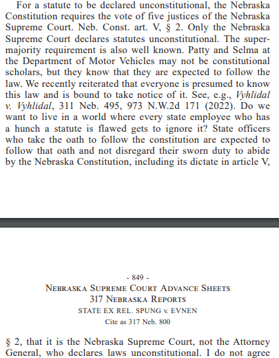 For a statue to be declared unconstitutional, the Nebraska Constitution requires the vote of five justices of the Nebraska Supreme Court. Neb. Const. art. V, 2. Only the Nebraska Supreme Court declares statues unconstitutional. The super-majority requirement is well known. Patty and Selma at the Department of Motor Vehicles may not be constitutional scholars, but they know that they are expected to follow the law. We recently reiterated that everyone is presumed to know this law and is bound to take notice of it…