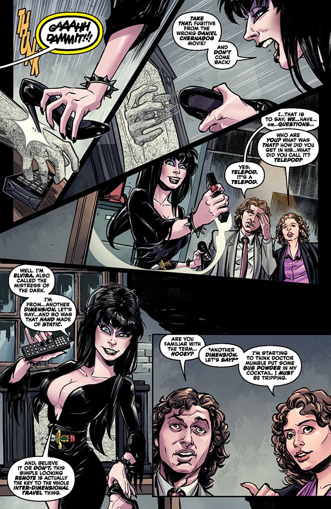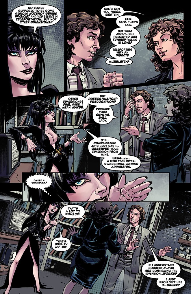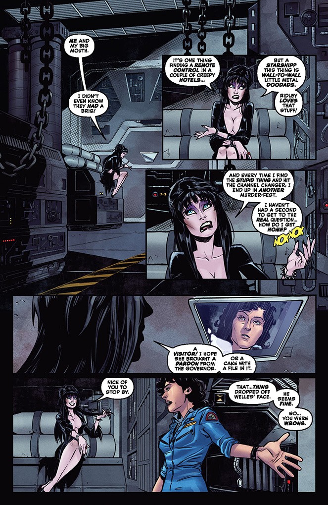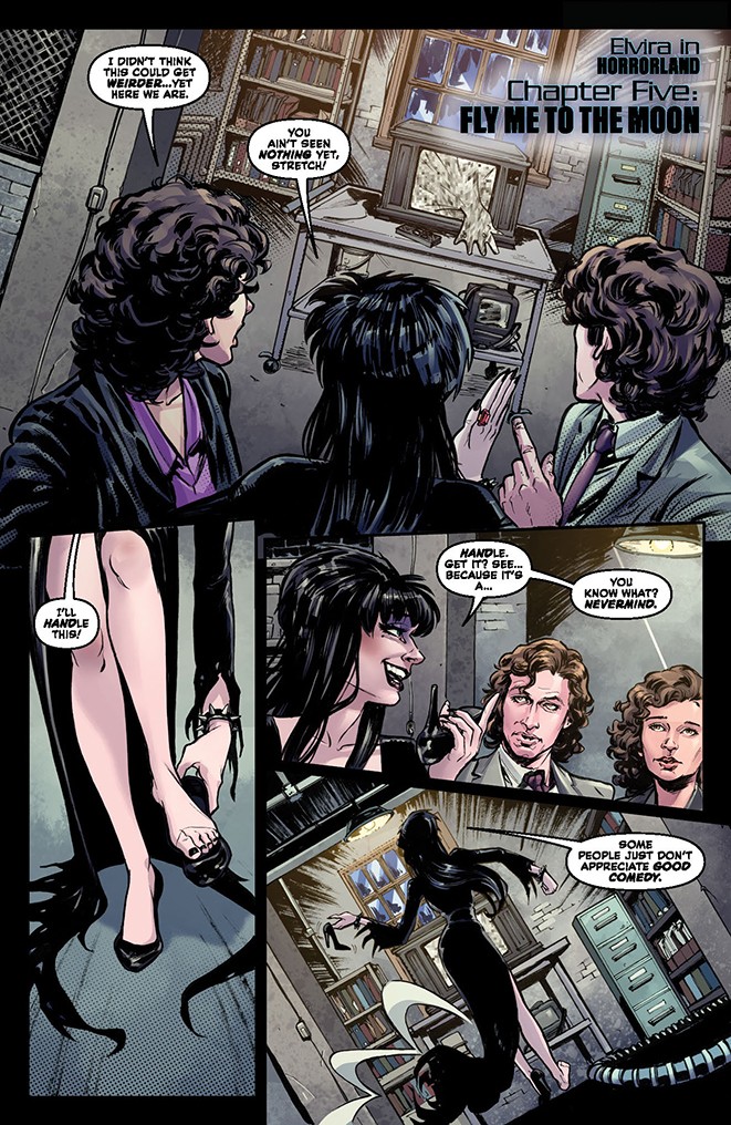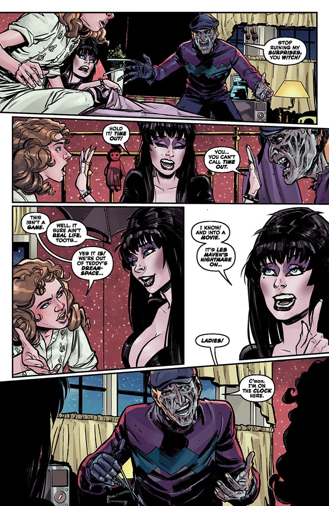 In her previous critically acclaimed comic book series, the Mistress of the Dark got to hang out with the ghost of her dearly beloved old friend Vincent Price. Therein, she discovered how sometimes the legends of film can come right into our world, and perhaps vice versa. In the final issue, Vincent revealed that each movie creates its own pocket dimension… and Elvira joined him on a quest into one such realm to rescue a “final girl” scream queen being held hostage by her obsessive director.