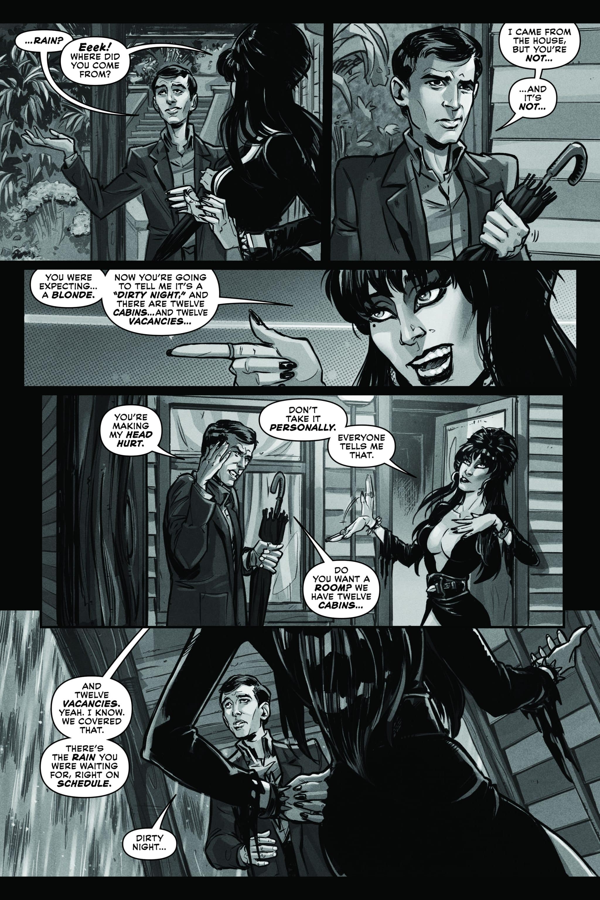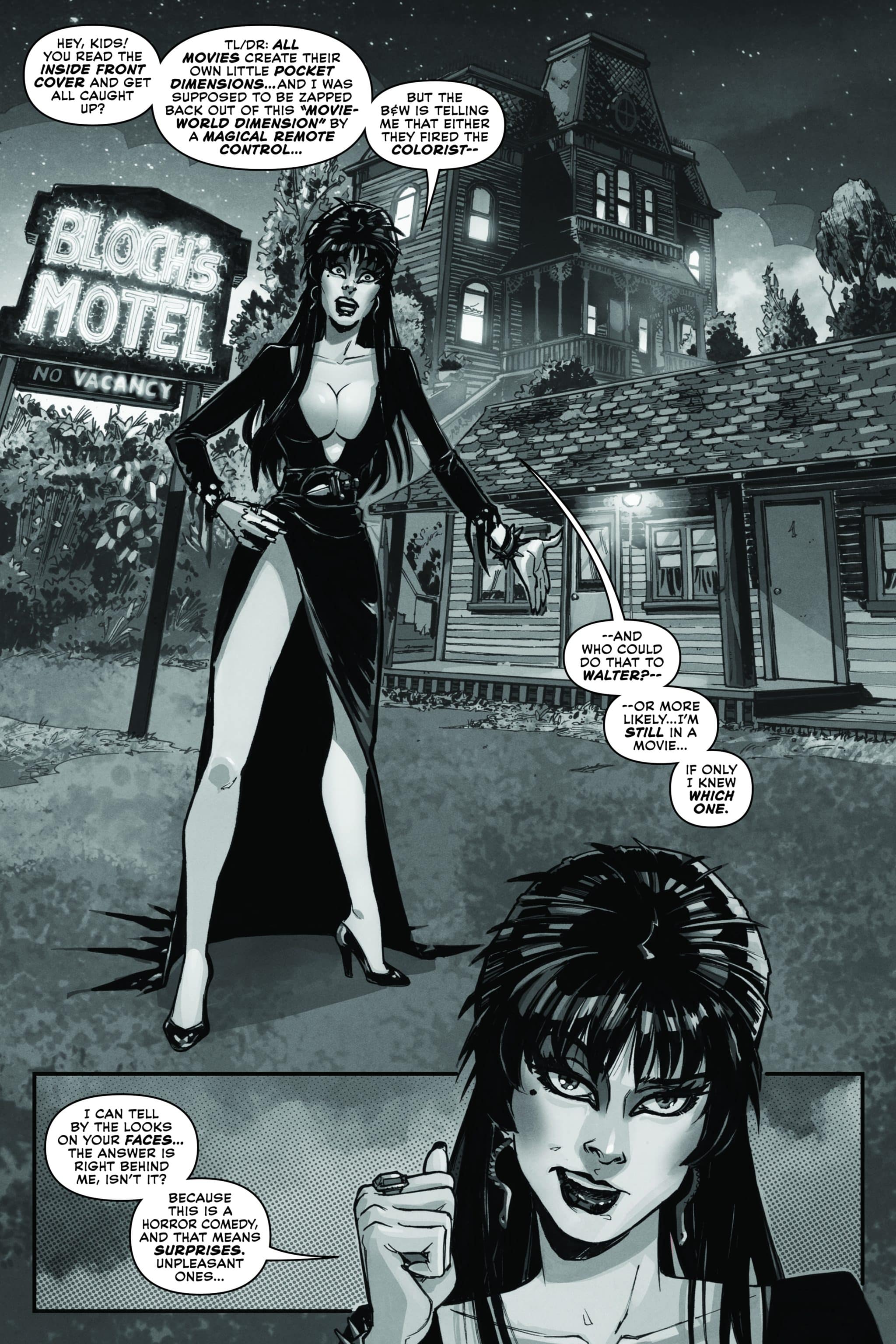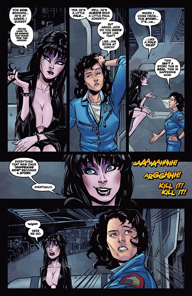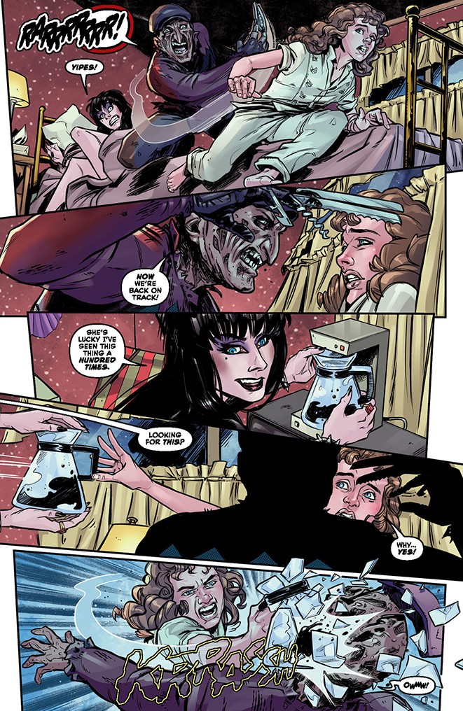 In her previous critically acclaimed comic book series, the Mistress of the Dark got to hang out with the ghost of her dearly beloved old friend Vincent Price. Therein, she discovered how sometimes the legends of film can come right into our world, and perhaps vice versa. In the final issue, Vincent revealed that each movie creates its own pocket dimension… and Elvira joined him on a quest into one such realm to rescue a “final girl” scream queen being held hostage by her obsessive director.