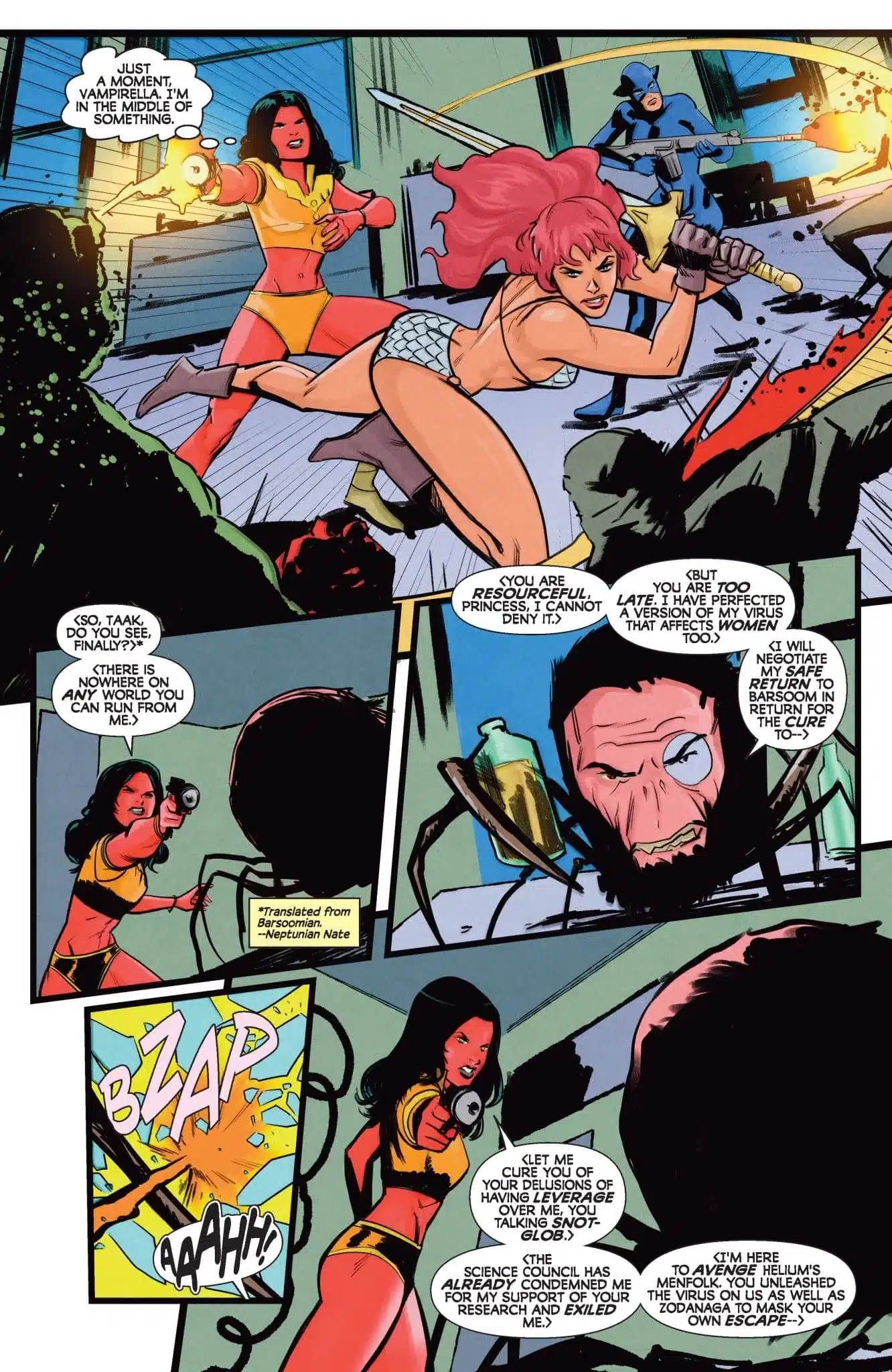 The next thrilling chapter in Fred Van Lente‘s ongoing zombie crossover epic is here, hitting everyone’s Local Comic Shop this Wednesday November 26. The undead are back to resume their feasting, with their sights set on the heroines of the Dynamite line including Vampirella, Red Sonja, Dejah Thoris, Miss Fury, Purgatori, and more. Outside the ironclad fortified gates of Sunset City, the virus has mutated and now targets men, leaving the universe’s most powerful women fighting to keep the plague at bay.
