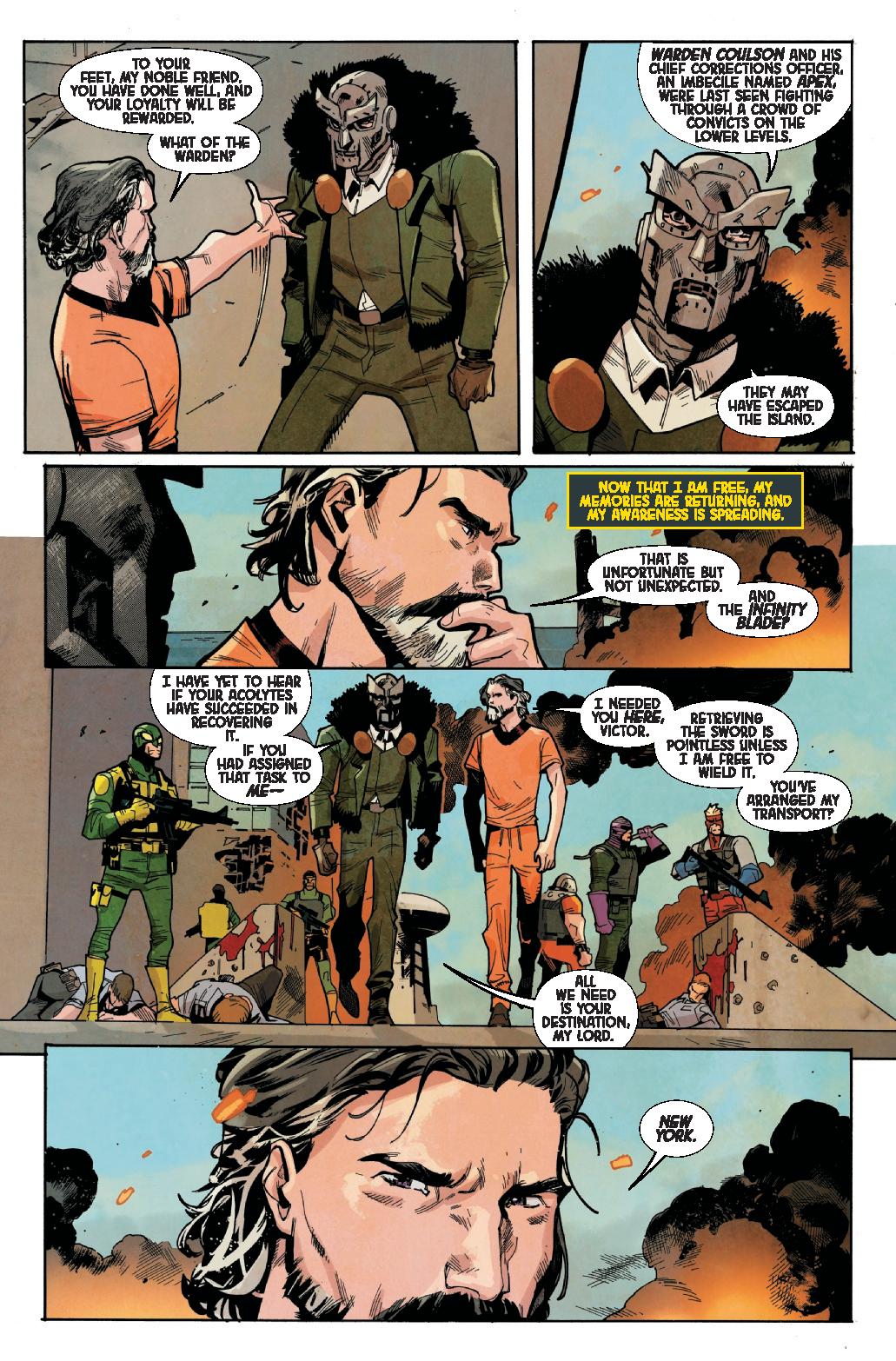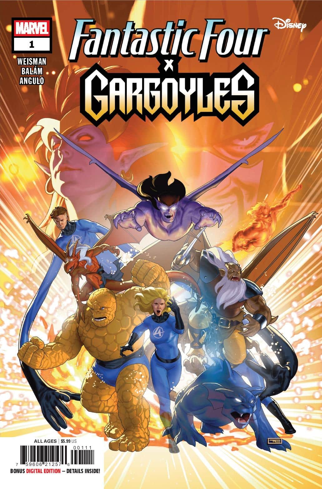 MARVEL’S FIRST FAMILY UNITES WITH THE MANHATTAN CLAN IN THIS EXCITING CROSSOVER! GARGOYLES creator and acclaimed Marvel writer Greg Weisman brings the Gargoyles to the Baxter Building alongside star artist Enid Balám! Danger strikes when the super villain Diablo learns stone gargoyles may hold the secret to eternal life…but the Gargoyles aren’t about to let him leech the blood of his own! Fortunately, they’ve got the help of expert Diablo-bashers – the Fantastic Four! Plus: Tony Stark and David Xanatos compare facial hair, Marvel’s own Gargoyle, Isaac Christians, bonds with his new kin, and more!