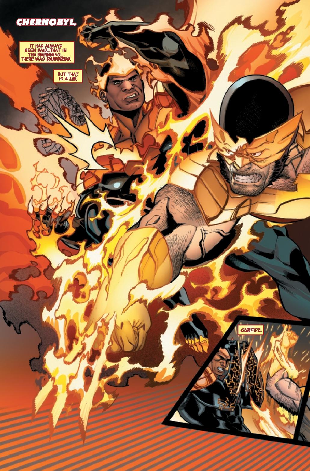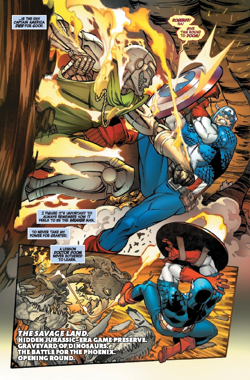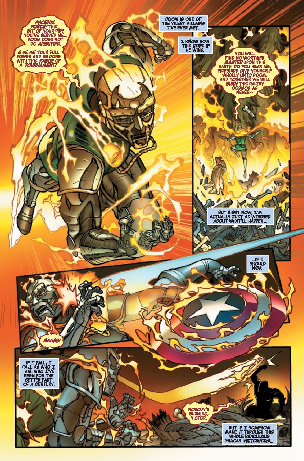 Javier Garrón provides the art along with David Curiel on color and Cory Petit on lettering. The art is a somewhat interesting aspect of the comic making best of Aaron’s disjointed script. While some panels lack details the focus and highlight is the battle between Captain America and Doctor Doom. It’s an anime/manga inspired fight full of energy blasts dripping of Phoenix Force. While Phoenix powered Doom isn’t all too exciting Captain America’s look is interesting though a bit “just happens”. The colors pop on the page emphasizing the energy oozing off of the combatants.