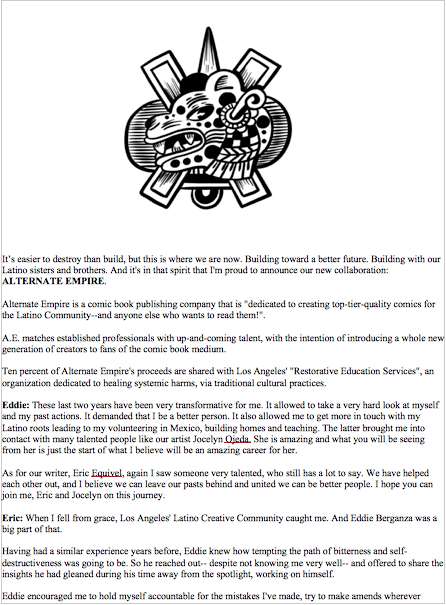 Two notorious individuals in the comic industry are coming together to form a new publishing venture, Alternate Empire. Eric Esquivel and Eddie Berganza have announced they’re “building toward a better future” with the new publisher which has a goal of “creating top-tier quality comics for the Latinx Community.” The first release will come to Kickstarter on March 1.