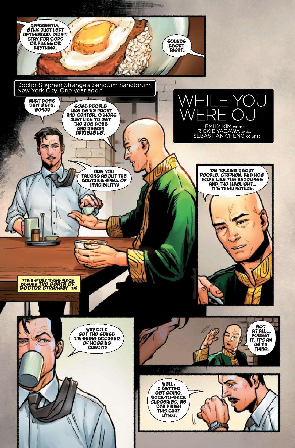 In “ Secrets”, we find Jimmy Woo and Shang Chi, as prey in a a challenge much akin to Saw coordinated by Crossfire, which finds them saying hard truths to each other, only to become closer for it. In “ Fool Me Twice”, Ms. Marvel meets a former love interest /fellow Inhuman/foe, who attempts to use her feelings about him against her but thankfully Shang Chi , shows up , to open her eyes. In “The Primeval Paradox”, Groot and Mantis take a trip to her home planet, but instead elicits memories of her family who been long gone. In the last story, “While You Were Out”, Wong fights off a creature trying to enter the Sanctum Sanctorum.