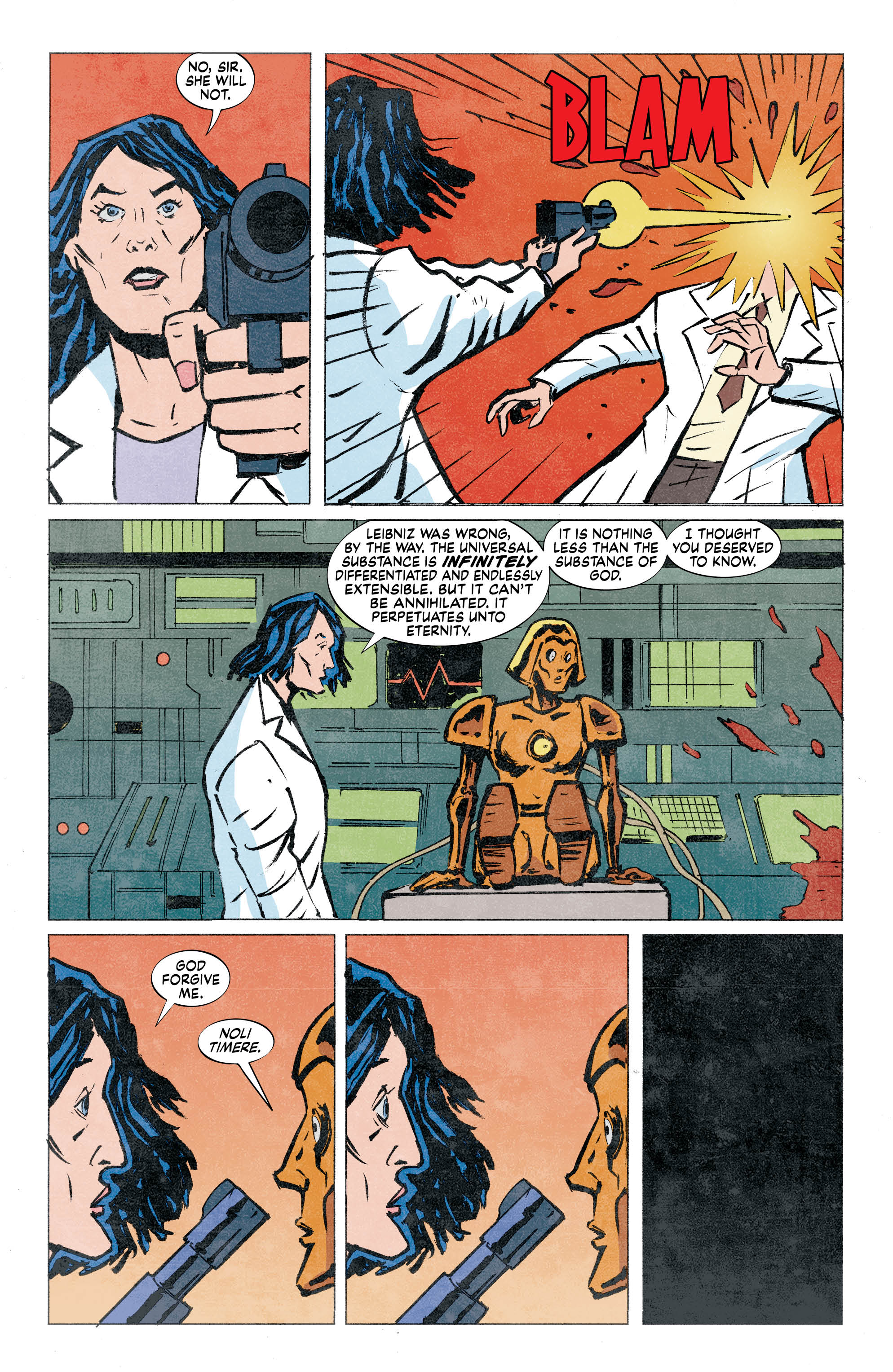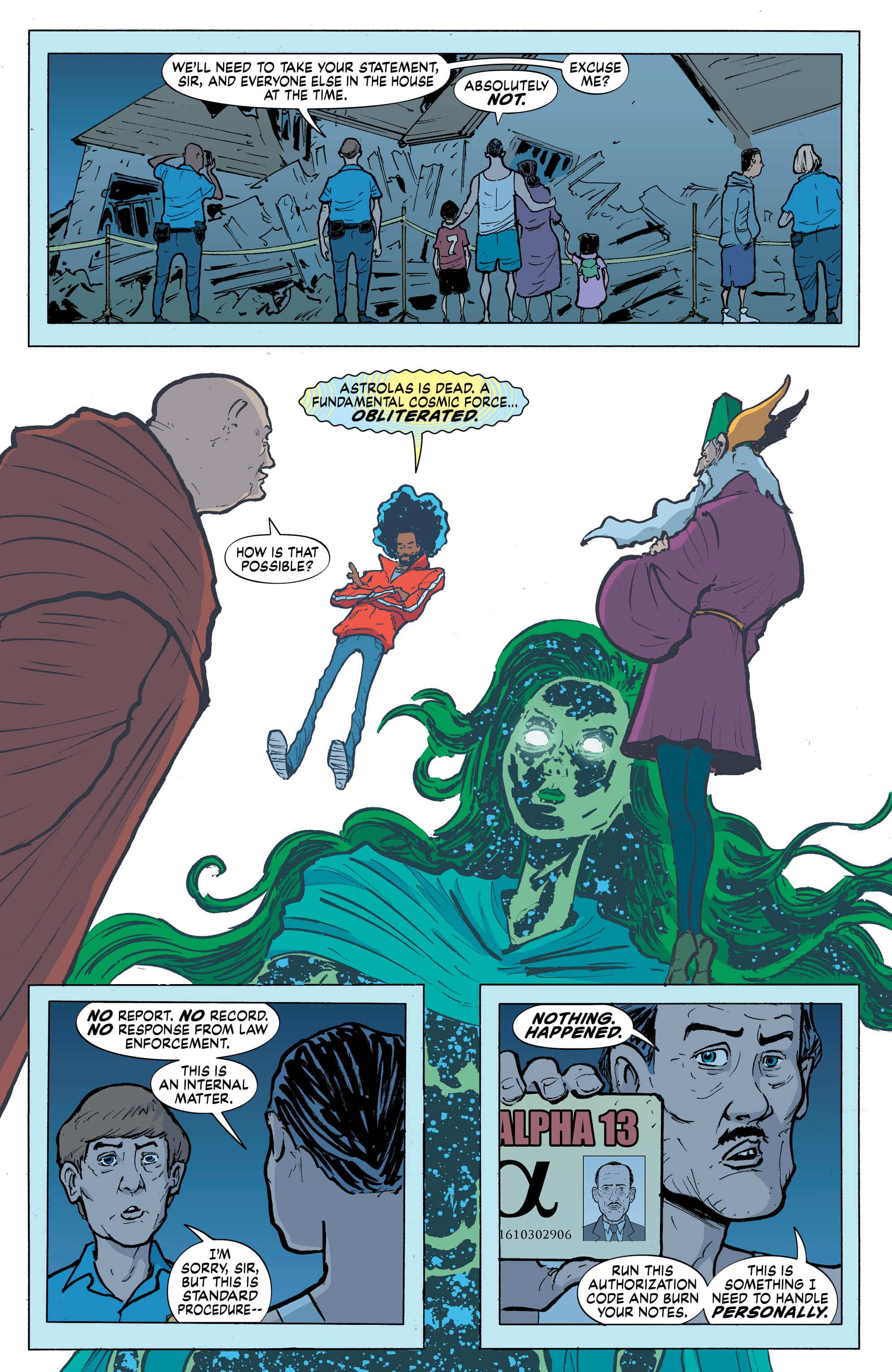 Visaggio and Liew convey a feeling that everyone who has ever suffered from anxiety or depression can understand of putting on a brave, happy, competent, and/or professional face when you want to cry, scream, or most of the time, just lie there motionless like when Caroline is making dark quips to her therapist about her suicide attempts. The use of humor to mask pain is definitely relatable, and using it to kick off Eternity Girl #1 immediately shows that Visaggio understands the nature of depression. She doesn’t sugarcoat things and isn’t afraid that after losing her purpose in life as a member of Alpha-13, Caroline feels like she’s just “killing time” and hoping that one of her futile (Due to her power set.) suicide attempts actually pan out. Immortal plus depression seriously sucks. However, in a literal earth and reality shattering third act, Caroline realizes that she has to pass as a functional human before she tastes death’s sweet release.