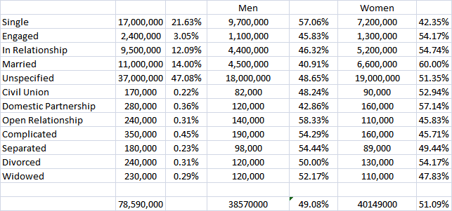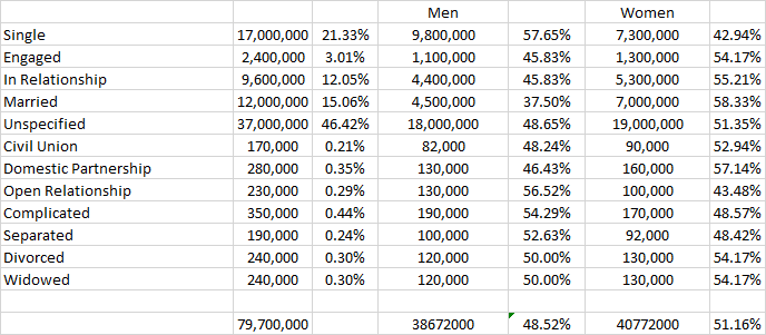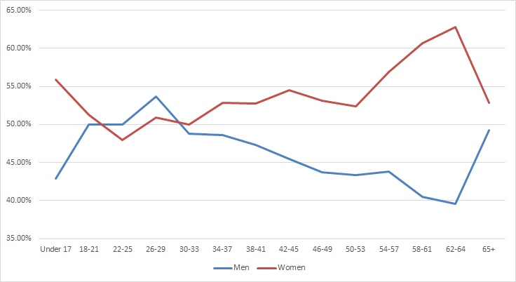 Similar to the previous month, things remain the same with men becoming a slim majority in the age 22-25 age group and then lose it in the 34-37 age group. It’s a similar statistic to the United States.