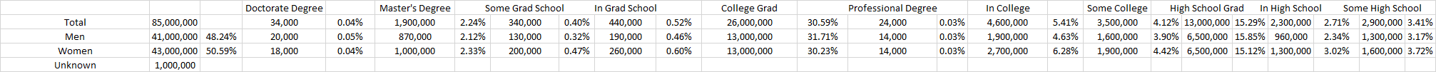 Things remain pretty steady when it comes to education. The percentages remain pretty much unchanged.