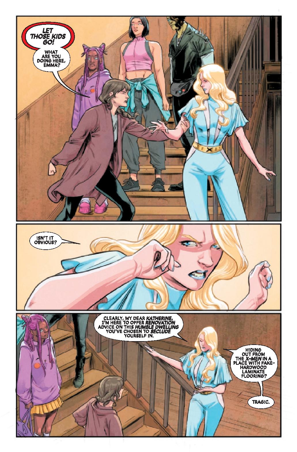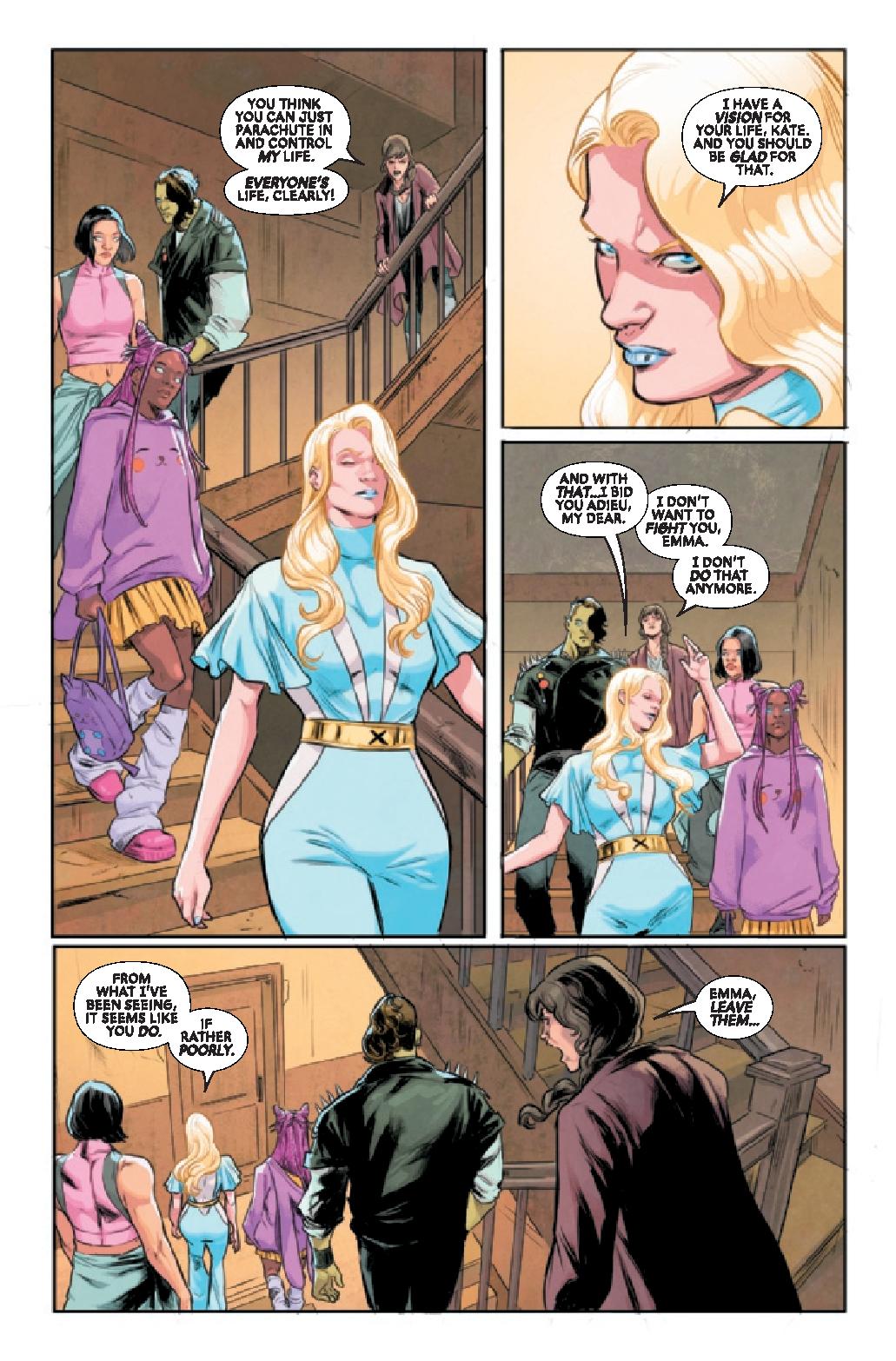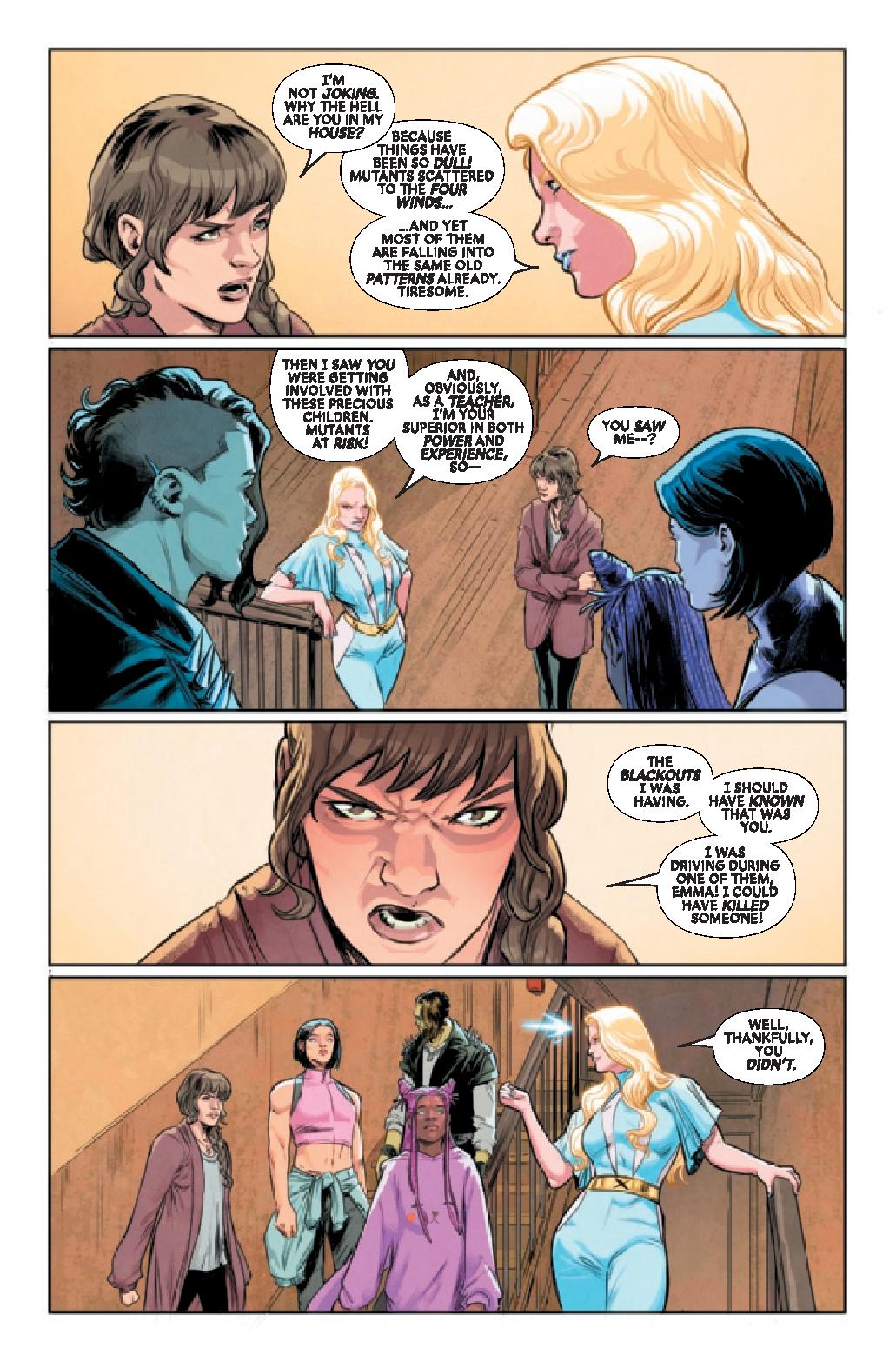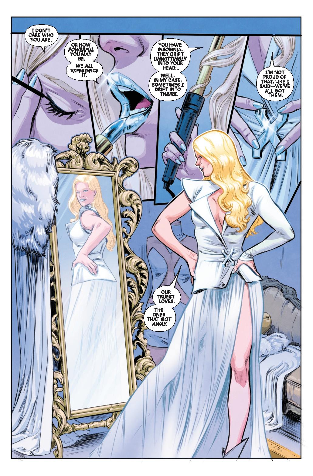 With Charles Xavier on the run, EMMA FROST and KITTY PRYDE reckon with their own dreams and fears for the future of mutantkind. AXO feels pushed away from the team and pulled closer and closer to charismatic technologist Sheldon Xenos. But is Xenos who he claims to be? (Spoiler: He is not!)