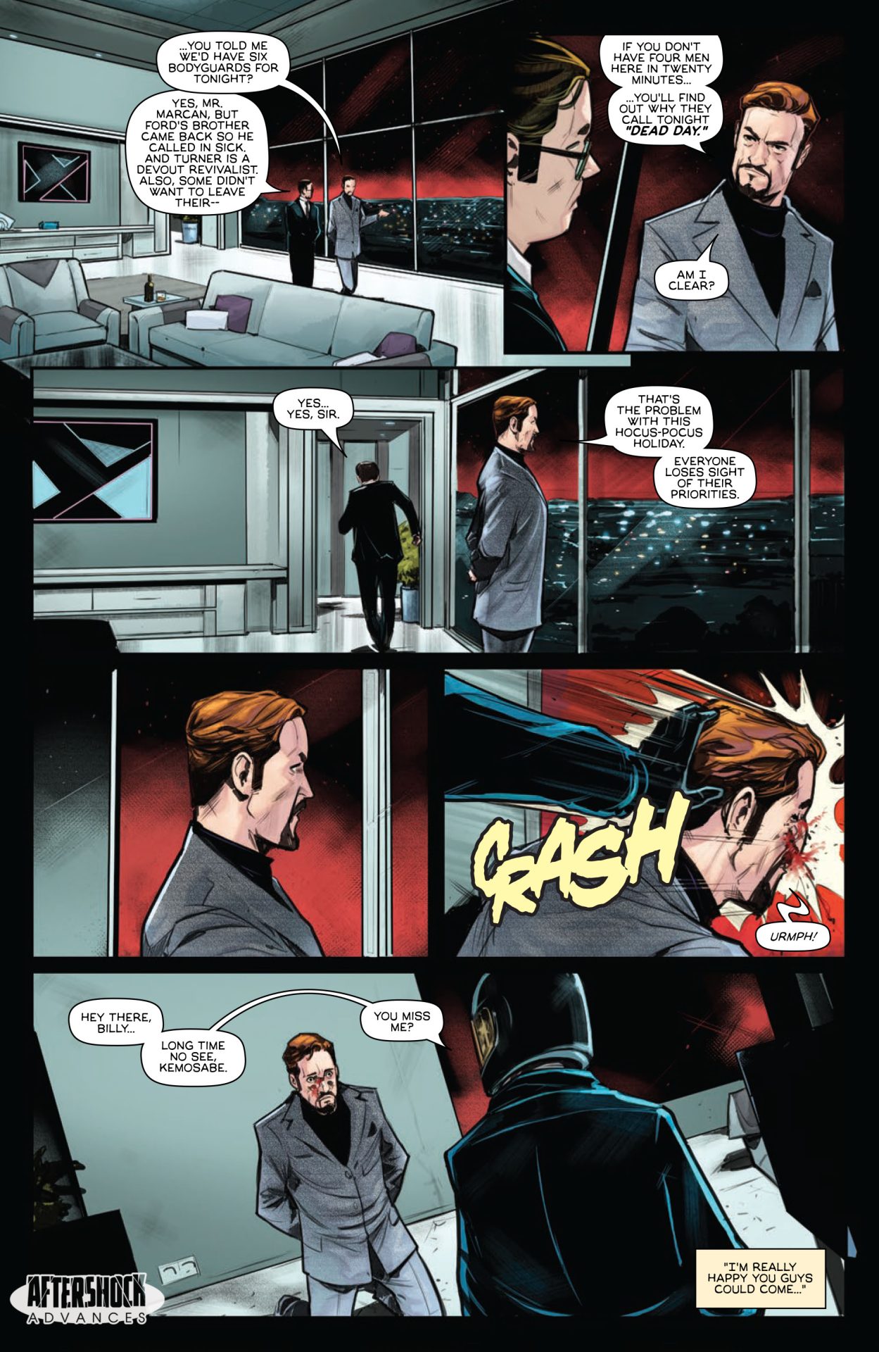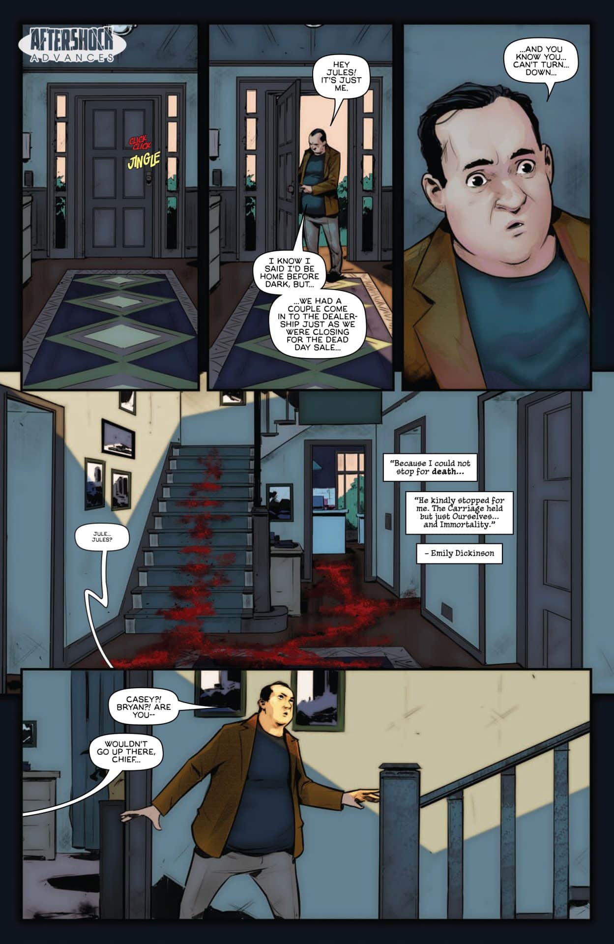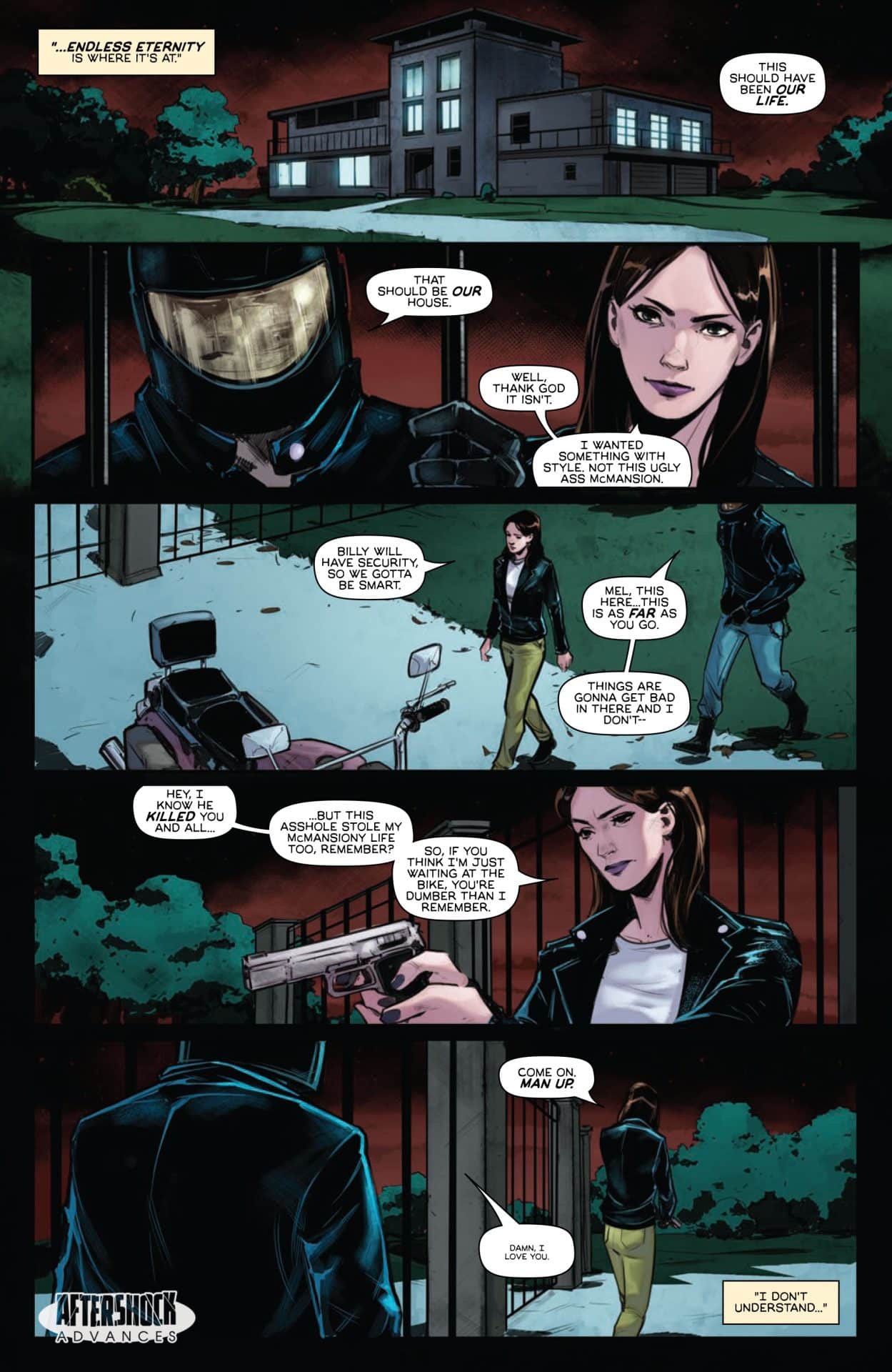 Writer Ryan Parrott has done a fascinating thing with this concept and series and by the time you reach the end of the first issue, it’s not what you expected at all. The story revolves around a family. The wife, Melissa, wants to celebrate, clearly interested in seeing someone. The husband, Daniel, wants to avoid the event like the plague. The daughter is a bit scared of what’s going on and the son, wants to flirt with a girl who’s part of a cult celebrating Dead Day.