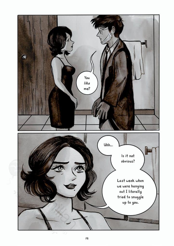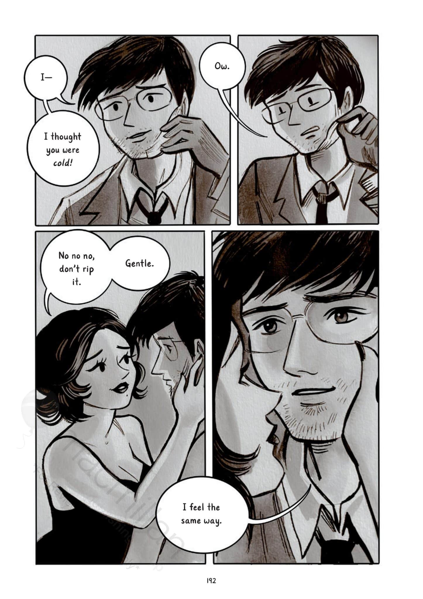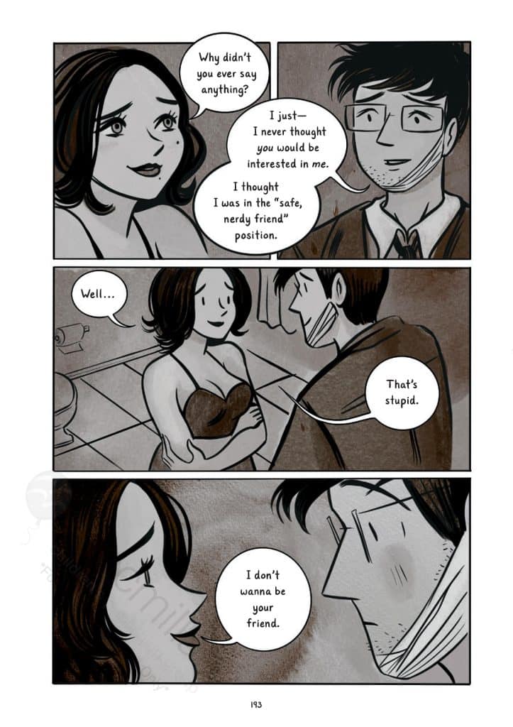 That being said, there’s a lot of care in what I chose to include and how I chose to frame it. As the artist, I’m shaping the story, reflecting on the past, providing context, etc. In order to tell this story, I had to give myself permission to creatively reconstruct the details of events and conversations that happened over 15 years ago. So some of the conversations that James and I have in the book are word for word, and others are written through the lens of memory, informed by what I know of our dynamic. My journals were very helpful in shaping this, but I definitely took creative license in condensing some of the timeline, changing people’s names and likeness to protect their anonymity, etc. By making this a very creative project “based” on my life, I was actually better equipped to arrive at what felt most true. By turning myself into a cartoon, I created a degree of separation that helped me feel comfortable being more vulnerable, open, and honest, I think. It’s like a magic trick.