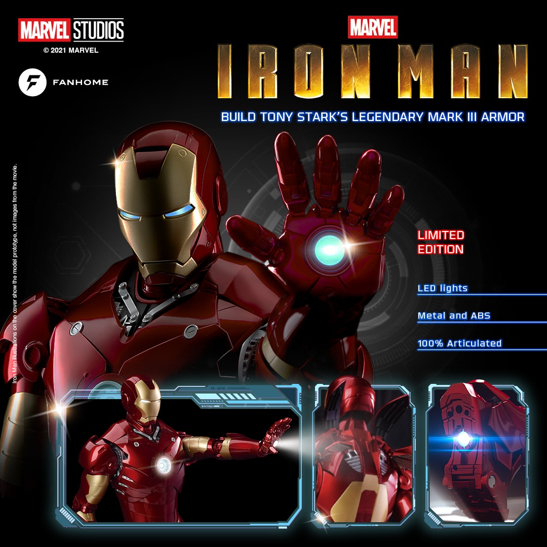 This authentic Marvel Studios’ Iron Man model is incredibly detailed and fully articulated as a large-scale reproduction of Tony Stark’s famous Mark III armor. A 24-inch, original model features full articulation and light-up effects for the reactor, hand repulsors, boot thrusters and mask visor. The build-up model’s intricate design and articulated pieces allow fans an inside view of the internal mechanisms powering the armor, making Fanhome’s Iron Man model an authentic masterpiece for collectors and modelers.