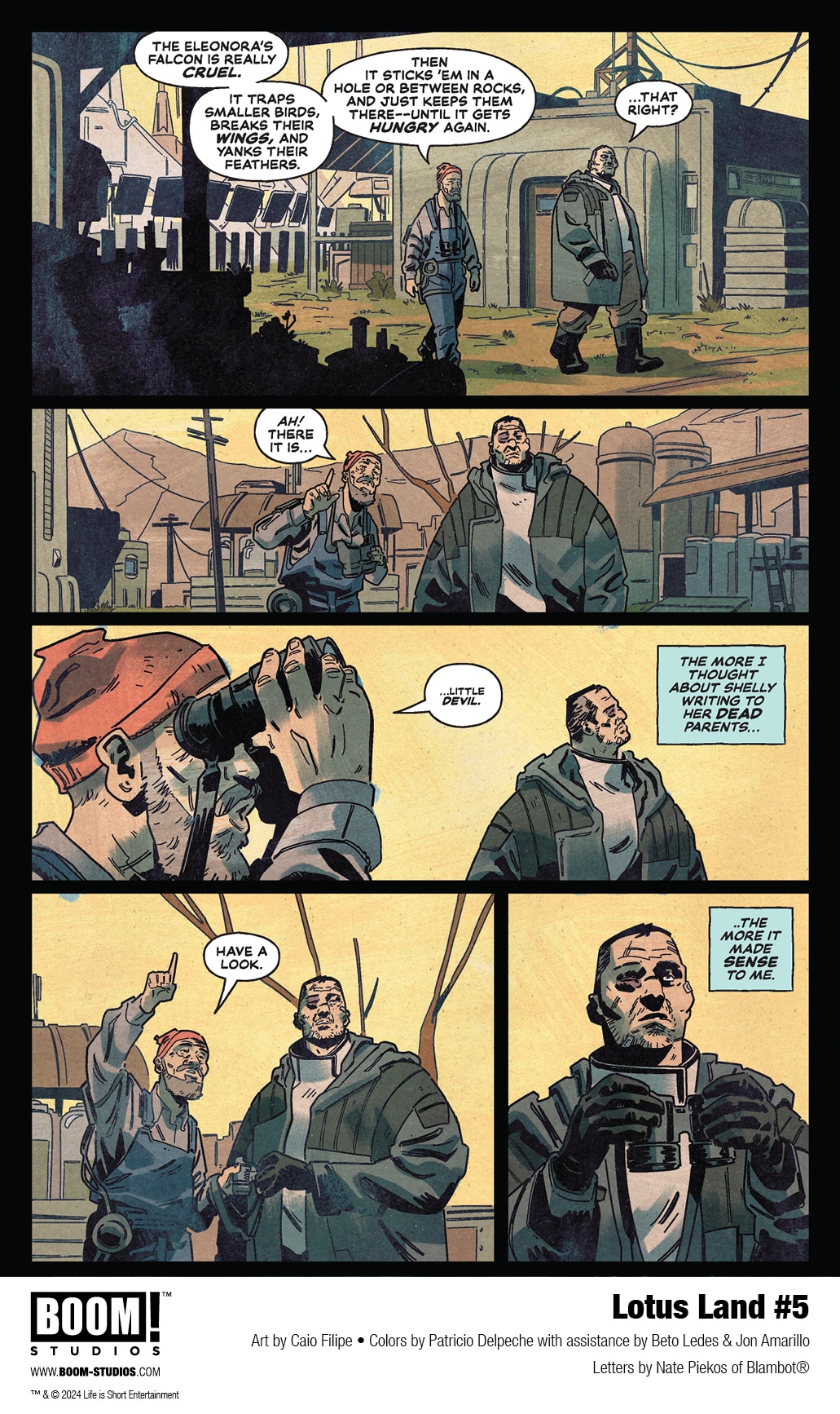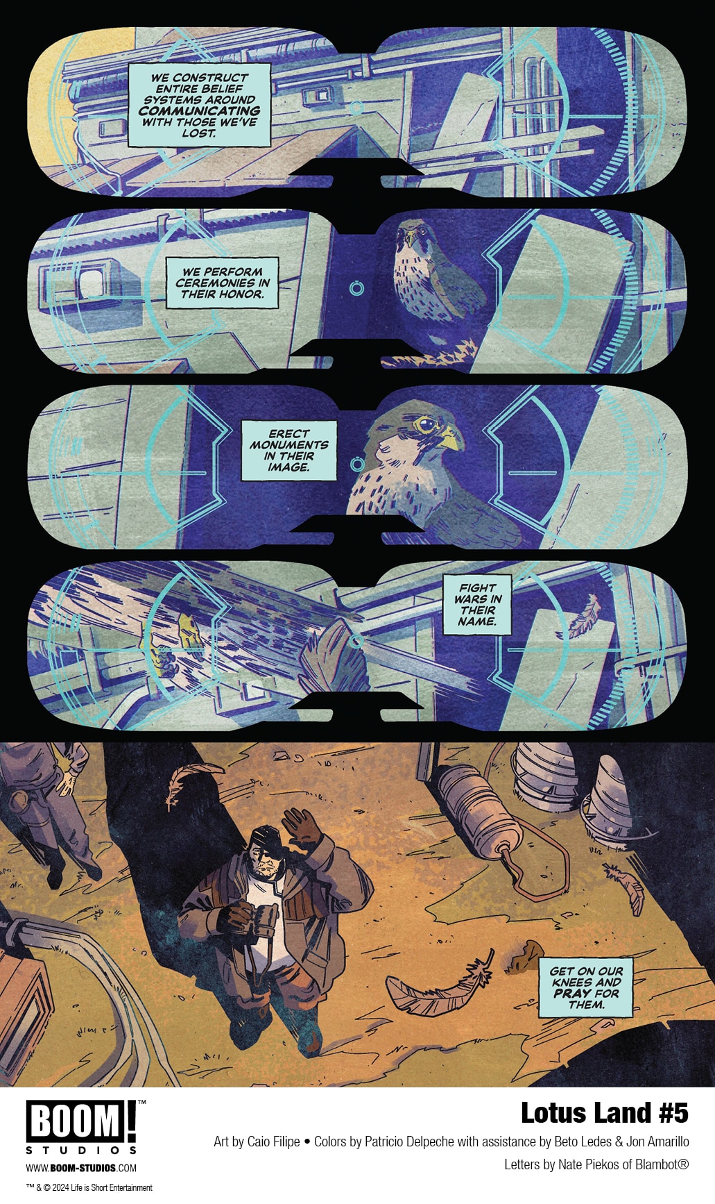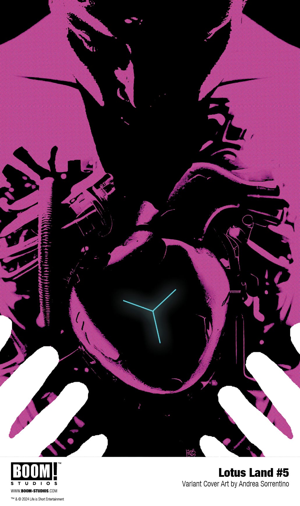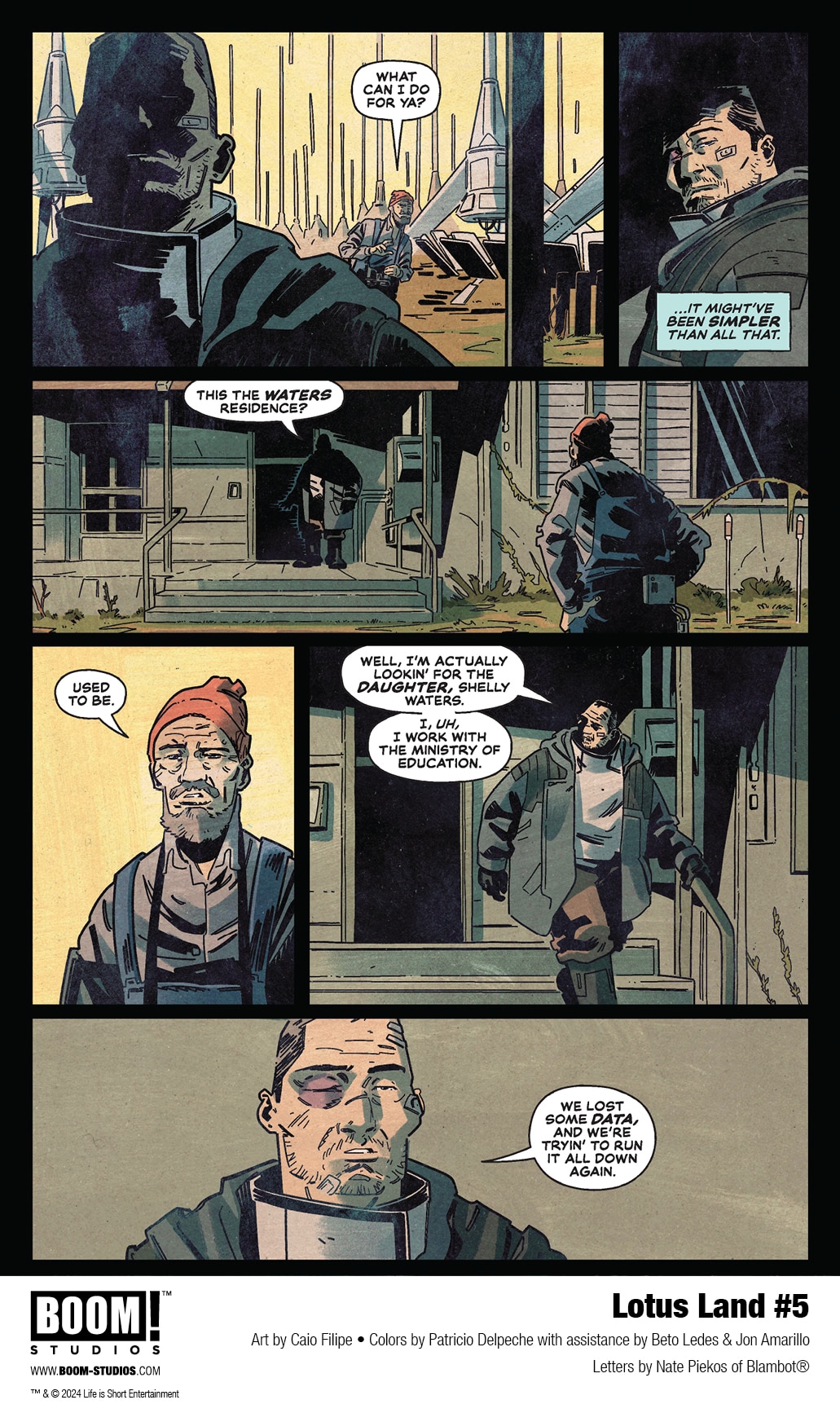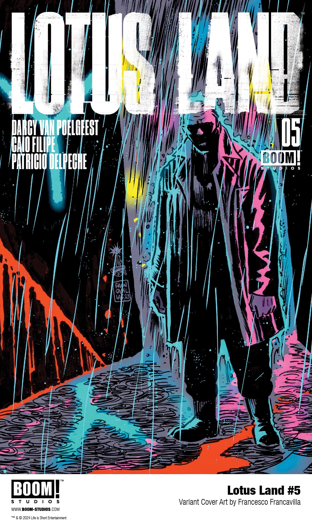 BOOM! Studios has revealed a first look at Lotus Land #5. Writer and director Darcy Van Poelgeest is joined by artist Caio Filipe, colorist Patricio Delpeche with assistance by Beto Ledes and Jon Amarillo, and letterer Nate Piekos of Blambot for a timely look at the human condition, set in a dystopic, cyberpunk future that’s as grounded as it is metaphysical. Welcome to Lotus Land, available March 20, 2024.