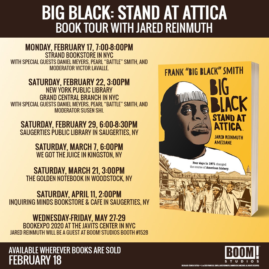 BOOM! Studios has announced the Big Black: Stand at Attica Winter Book Tour, in support of the new graphic memoir written by Frank “Big Black” Smith and Jared Reinmuth and illustrated by Améziane, available in comic shops on February 12, 2010, and in bookstores on February 18, 2020.
