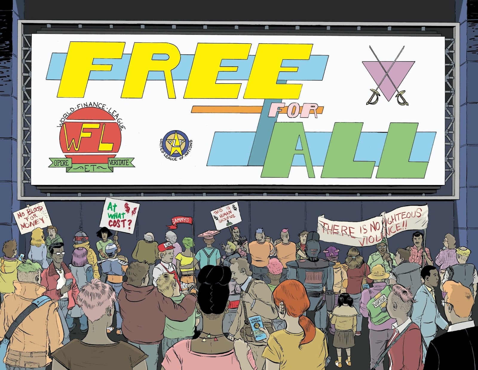 It’s every shareholder for themselves when death and bankruptcy collide in Free For All #1, a giant-sized, one-shot spectacle of commerce and carnage coming this March from Eisner Award-nominated cartoonist Patrick Horvath!