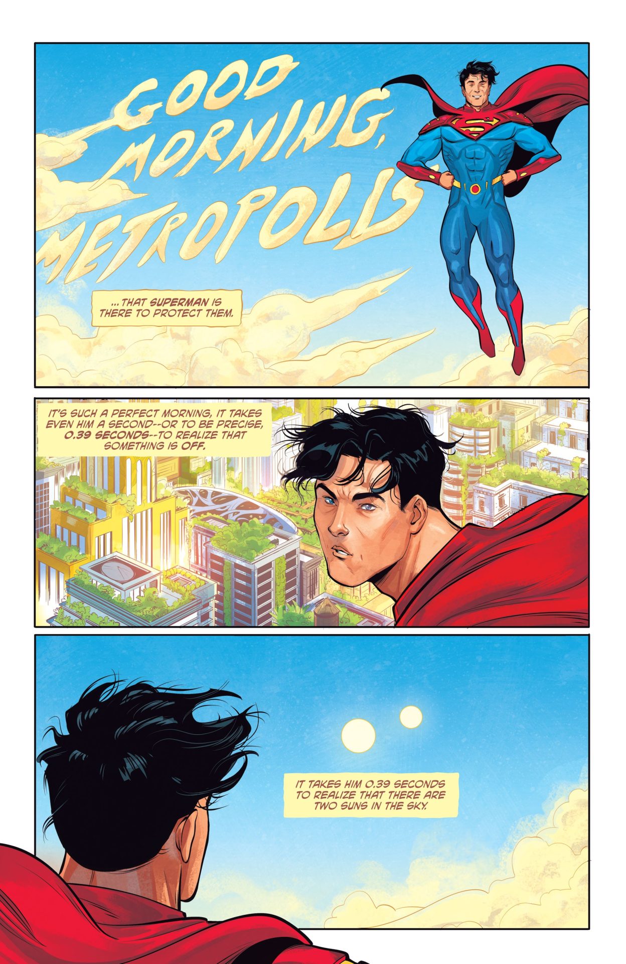 Future State: Superman/Wonder Woman #2 concludes with a story that is part classic World’s Finest, part Grant Morrison’s JLA (Think the one where Superman wrestled an angel.), and all heart. Writer Dan Watters sets up a plot with mythic stakes, namely, a race and fight against two iterations of the sun: the villainous Solaris (Aka the Tyrant Sun from Morrison’s DC One Million) and Kuat, who is the sun god of the Kamayura people from the Amazon rain forest. Wonder Woman (Yara Flor) is set to fight the god from her pantheon, and Superman (Jon Kent) is set to fight the villain from his rogue’s gallery, but Watters throws in a little switcheroo that makes the match up an extra fun combination of mythology and science, brains and brawn. Having a hero fight another hero’s bad guy is just a plain enjoyable trope, and Watters, Leila Del Duca, and Nick Filardi lean into big time with hilarious reaction shots, flashy colors, clever monologuing, and one big, damn punch.