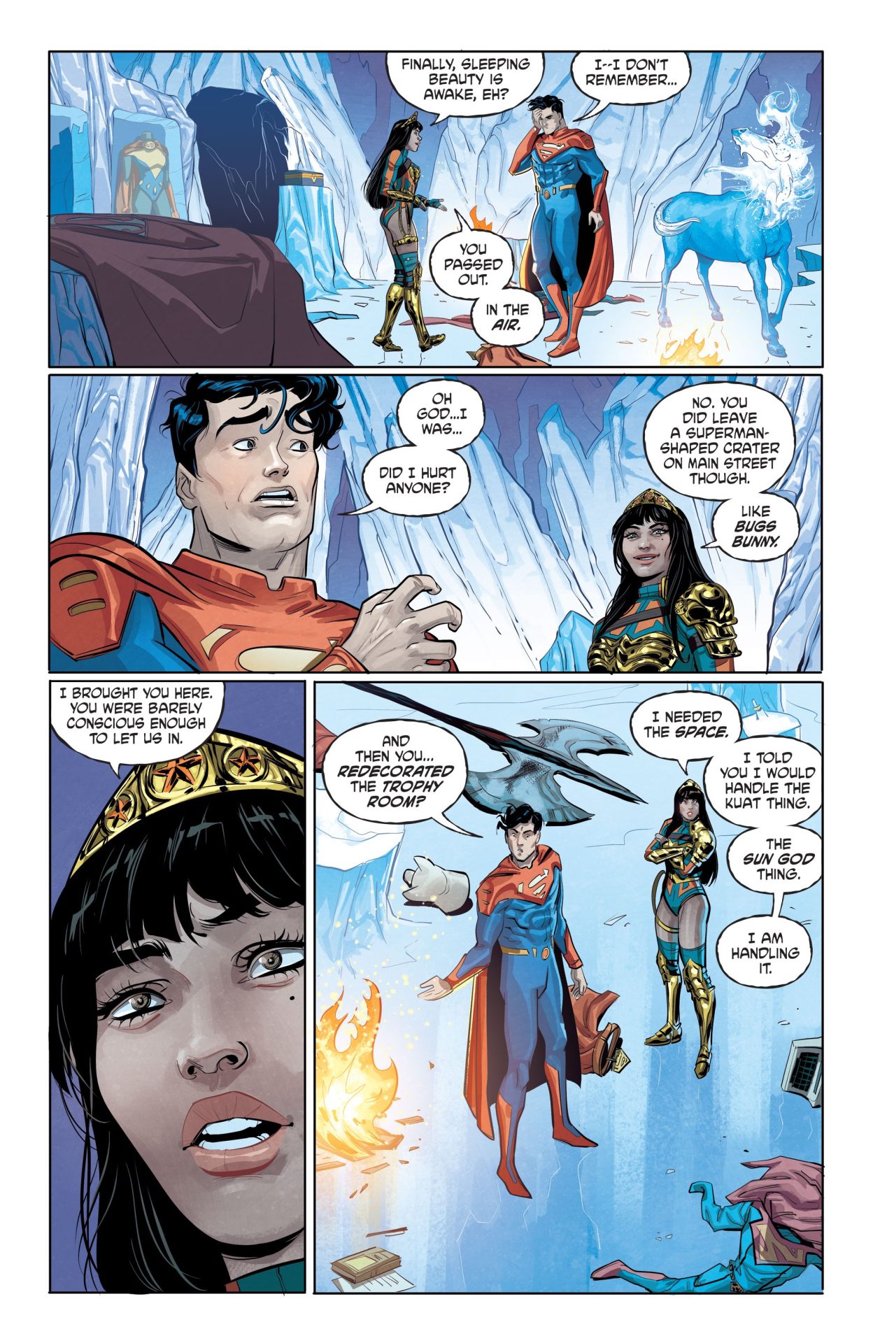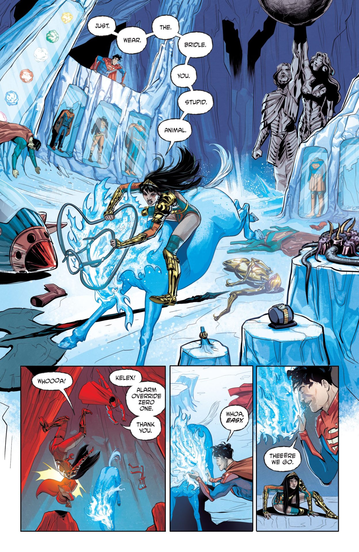Future State: Superman/Wonder Woman #2 also explores the heroic burden that Jon has set for himself as he basically says that his job as Superman is to maintain Earth and beyond’s status quo in a stirring monologue coupled with some earnest facial expressions from Del Duca. Although it’s the future, he’s the embodiment of the Protestant work ethic and is always completing some task or other throughout the comic and seems deathly scared to delegate tasks to other heroes like Yara. Speaking of Yara, she provides a lighter counter-measure to Jon and believes in things like work/life balance (See the previous issue where she took a break from superheroing to have a drink with her buddies.) and disorganized organization as she figures out why Jon is disoriented and weakened in the first pages of the issue. Filardi uses big reds and blues that visually convey blaring alarms saying, “Superman down” in the first page, but then Leila Del Duca and Dan Watters nail a comedy beat with Yara trying to tame a Headless Mule.