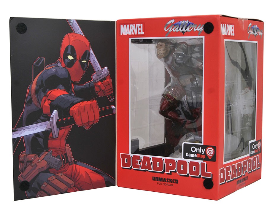 Now available at GameStop stores and online, the Unmasked Deadpool diorama features an exclusive unmasked head sculpt, showing the scarred mug of Wade Wilson, the Merc with a Mouth. Leaping from a swirling flame, Wade wields his twin katanas with professional precision in this handcrafted sculpt by Jean St. Jean, based on a design by Nelson Asencio. Also available from GameStop is the exclusive X-Force edition of Deadpool, in which Wade wears a masked, grey version of his costume to mark his time with that black-ops team of X-Men.