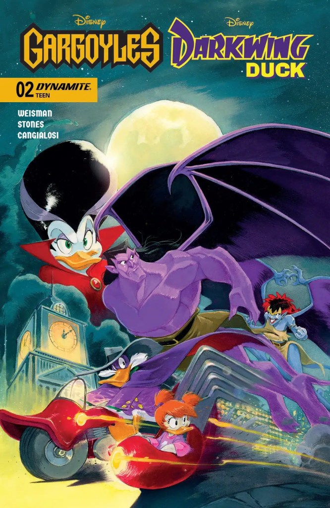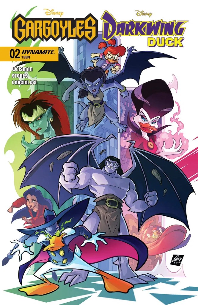 Gargoyles creator GREG WEISMAN and Darkwing Duck creator TAD STONES join forces with acclaimed artist CIRO CANGIALOSI to bring the Defenders of St. Canard and the Manhattan Clan together for an adventure so epic that no single continuity could contain it! After contacting a wary Morgana Macawber through her magic mirror, the scheming Demona whisks the uncooperative sorceress out of St. Canard and into her New York City lair, where she proceeds to grill Morgana for the location of a certain mystical tome with enough eldritch energy to allow Demona to finally conquer the world. Darkwing Duck, of course, isn’t about to take this lying down. As soon as he learns about Morgana’s abduction, DW and his stalwart sidekick Launchpad McQuack are in the air, racing towards the Big Apple to rescue his avian amour. But will the Terror That Flaps in the Night be able to handle the City That Never Sleeps — not to mention the stone guardians who protect it? Find out in the action-packed first issue of GARGOYLES/DARKWING DUCK, featuring tantalizingly transformative covers by STONES, CANGIALOSI, DECLAN SHALVEY, and IVAN BIGARELLA — as well as an exclusive BLIND BAG VARIANT!