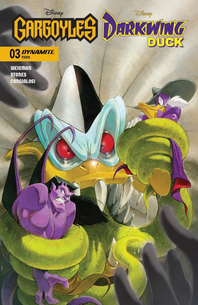 DEMONA WILL MAKE SURE THIS CAGED DUCK SINGS! The creators of the original Gargoyles and Darkwing Duck animated series return for the second installment of their hotly anticipated comics crossover adventure! With Darkwing’s magical amour Morgana Macawber now in Demona’s clutches, it’s a race against time for the Terror That Flaps in the Night to locate the two sorceresses before Morgana is coerced into revealing the location of the sinister spell book known as the Quackronomicon — and thus handing Demona the keys to world domination! But DW won’t get far without Elisa and Goliath’s help — and the head of the Manhattan Clan is down for the count until sunset. With half a day of downtime to contend with, can this unlikely trio of heroes crack the case before Morgana cracks under Demona’s interrogation? And while we’re on the subject, what have Launchpad and Gosalyn been doing all this time? The answers to these and many more burning questions will be revealed in the portent-filled pages of Gargoyles/Darkwing Duck #2 — crafted by tandem authors GREG WEISMAN and TAD STONES and artist CIRO CANGIALOSI, and enriched by hand-carved covers from STONES, CANGIALOSI, CLAYTON HENRY, and IVAN BIGARELLA!