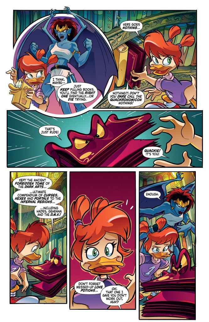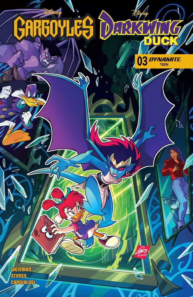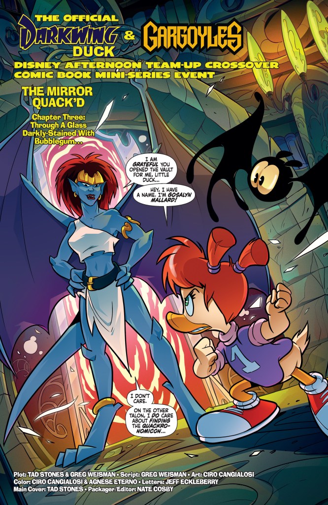 THROUGH THE LOOKING GLASS! Things go from bad to catastrophic as Demona — despite Gosalyn’s best efforts to thwart the rogue Gargoyle — cracks open the wizard Gandersnatch’s vault inside the Mirror Realm and claims the terrifying tome known as the Quackronomicon for her own! But what hair-whitening horrors will she summon from its eldritch depths? And more important, how can Darkwing, Goliath, and their erstwhile allies stop them? Find out at least some of the answers in the action-filled pages of Gargoyles/Darkwing Duck #3 — painstakingly packaged by co-authors GREG WEISMAN and TAD STONES and artist CIRO CANGIALOSI, with polishing touches from STONES, CANGIALOSI, CARLO LAURO, and IVAN BIGARELLA!