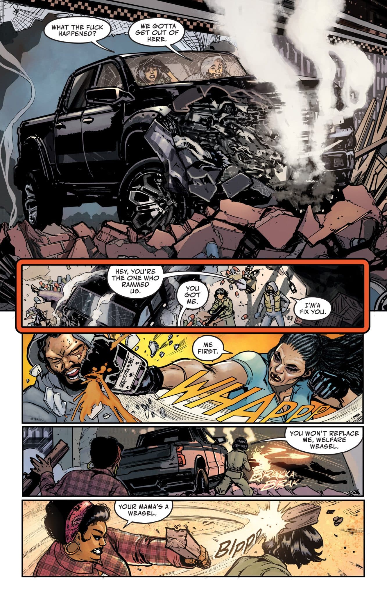 Death for Hire: The Origin of Tehk City is created by Ice-T, Arabian Prince, and Tommy The Animator, with a script by Gary Phillips and illustrations by Montos.