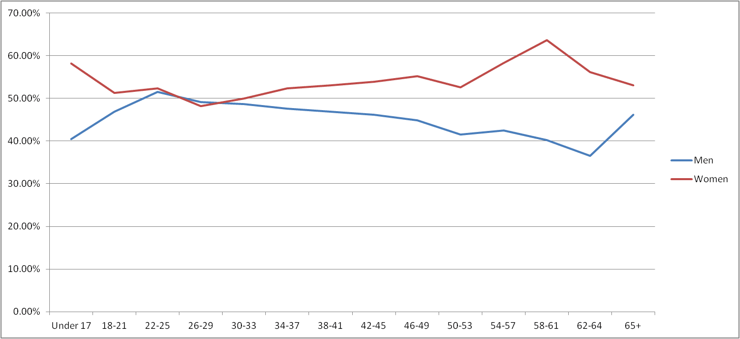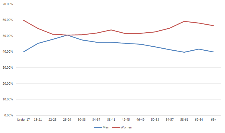 Similar to the previous month, we see men become the majority at age grouping 22-25 and become the minority at the group 30-33. The graph is similar to the previous month.