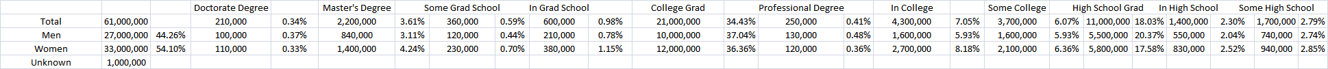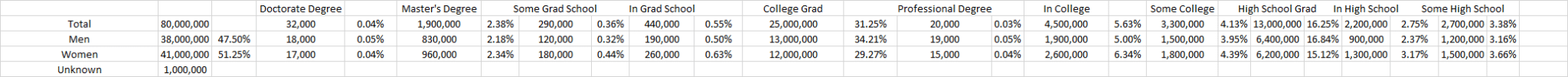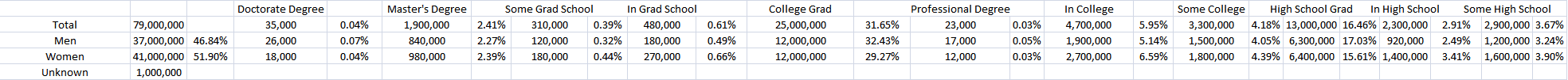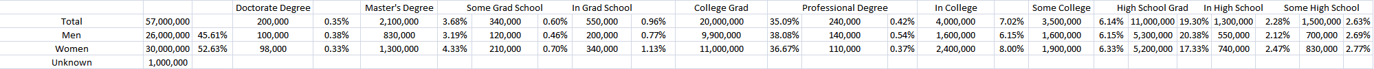 Much like “relationship statue,” education hasn’t shifted all that much either, even with the change in overall population. Some increased, some decreased.