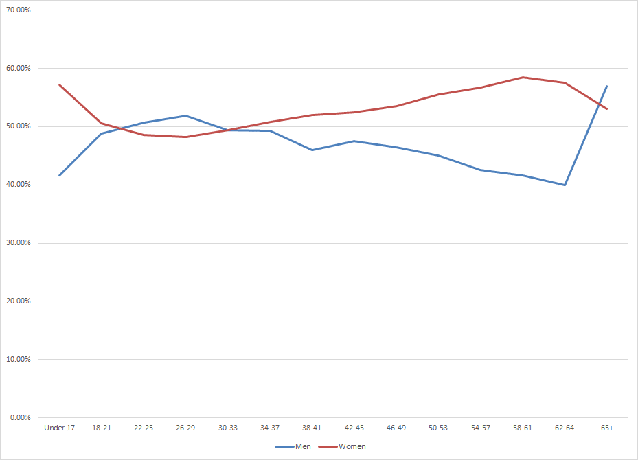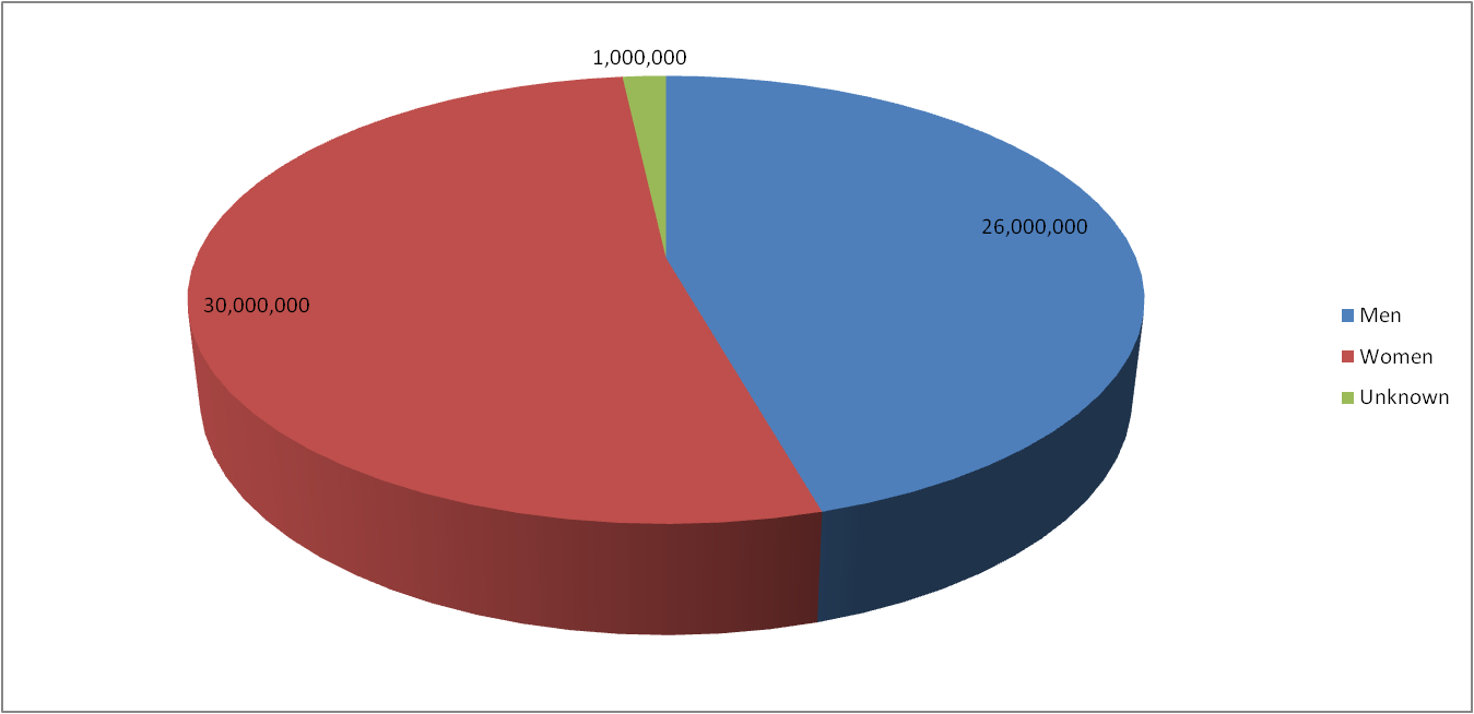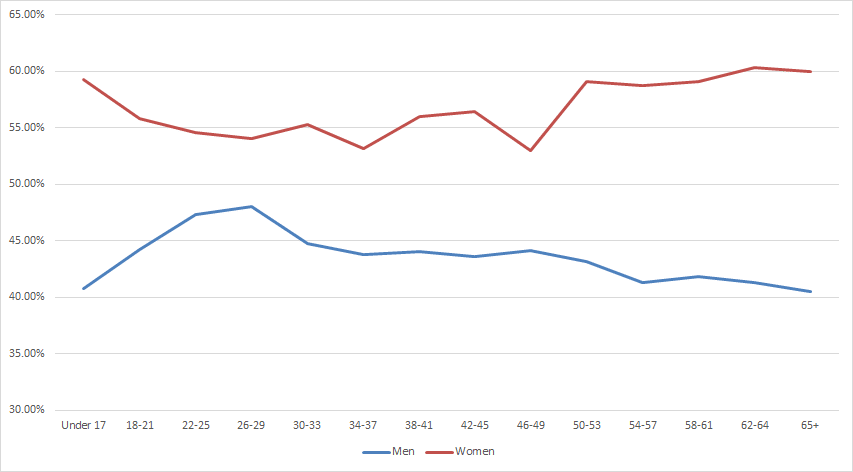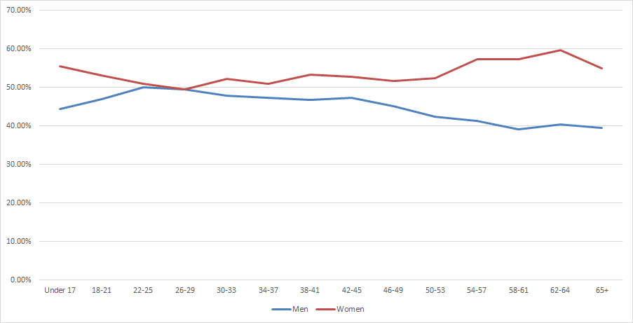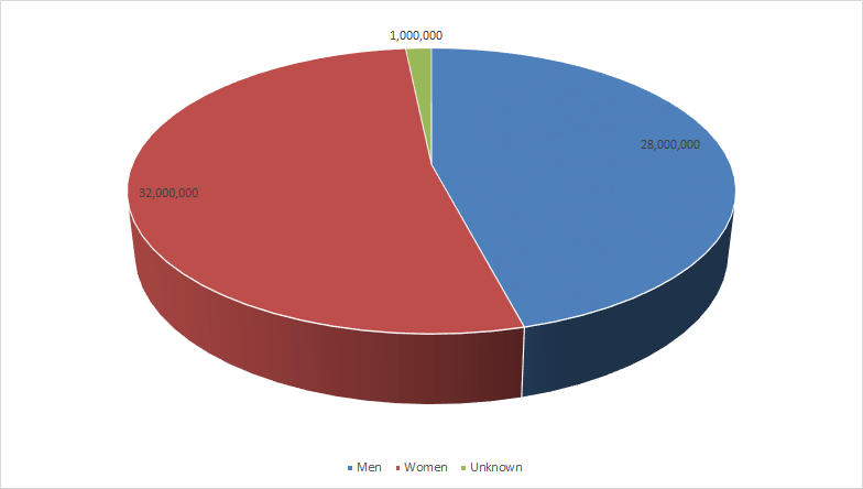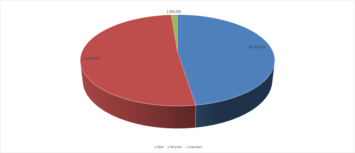 In the last report, women accounted for 50.59% while men accounted for 48.24%. This month things shifted. Men now account for 47.62% and women 51.19%. The 1 million individuals whose gender is unknown is still present this month..