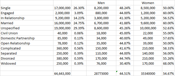 This data is compiled using key terms, “likes,” users have as part of their profiles. Primarily terms are focused on generic ones such as “comics” or “graphic novels” or publishers. I stay away from specific characters, creators or series, because this does not indicate they are a comic book fan. Over 100 terms are used for this report.