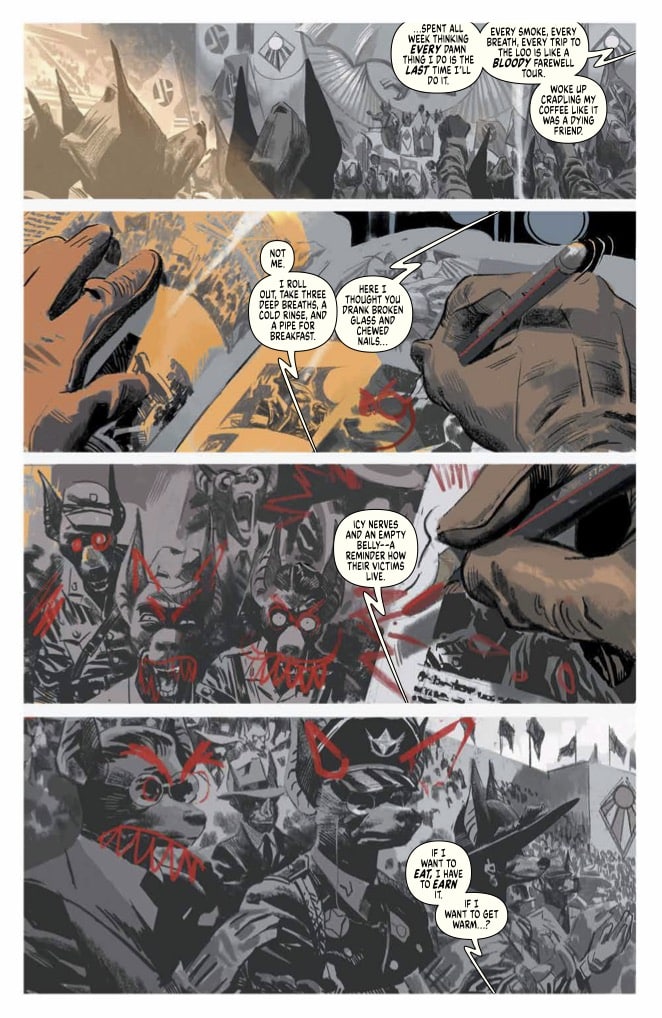 The Scumbag will join Remender’s growing Giant Generator Studios empire, alongside such salesbeasts as Death Or Glory with Bengal, Seven to Eternity with Jerome Opeña, Low with Greg Tocchini, Fear Agent with Jerome Opeña and Tony Moore, Tokyo Ghost with Sean Gordon Murphy, Black Science with Matteo Scalera, Strange Girl with Eric Nguyen, Deadly Class with Wes Craig, and more.