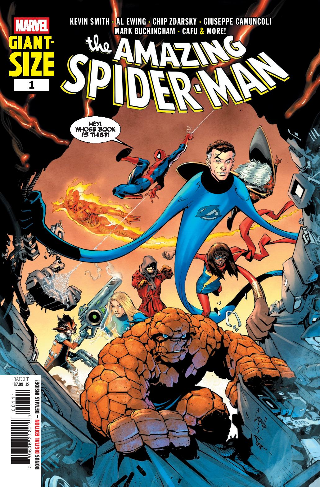 Summer starts with a bang with GIANT-SIZE AMAZING SPIDER-MAN #1! Kevin Smith makes his triumphant return to Marvel with a Spider-Man story that will have your heart beating in overdrive and your sides hurting from how much you’re laughing. As if that wasn’t enough, Al Ewing and Mark Buckingham spin a decade-spanning adventure with Spider-Man and some of his best friends! And if that weren’t enough, Chip Zdarsky and CAFU introduce a brand-new character who will play a big role in the future of Marvel Comics! Don’t miss it!
