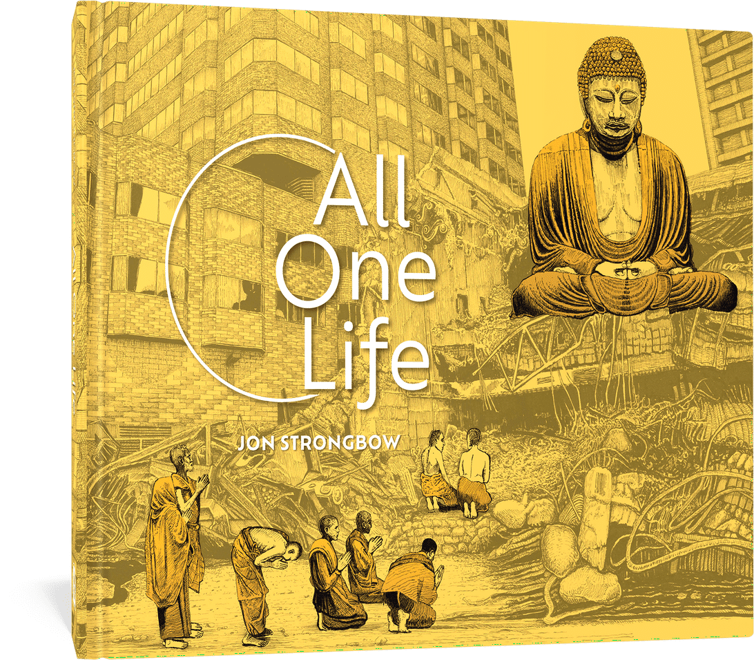 Inspired by a 3-page comic by the French cartoonist Jean Giraud (Moebius) illustrating a speech by Chief Seattle, Seattle-based cartoonist Jon Strongbow went on a spiritual journey. He studied at the Red Cedar Circle, a community dedicated to the ancient teachings of the First Peoples of the Northwest Coast, attended a local Tibetan monastery, and was mentored by local native healers and medicine people. Deeply moved by these teachings, he sought to honor the culture of the original inhabitants and refute the devastation wrought upon them by depicting today’s Seattle imbued with ghosts of the original inhabitants of Northwest Coastal natives.