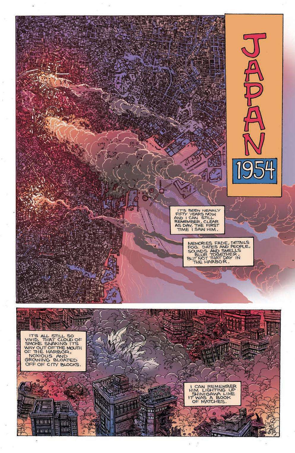 Issue 2, with story and art by Bob Eggleton, felt like a biblical epic thanks to the painted illustrations inspired by John Martin’s The Last Judgement paintings and the works of Gustave Dore. It pitted a Godzilla 2000-style protagonist against four of his classic foes and used prose in narration boxes to make the issue feel like some ancient legend. I liked issue two much more for the gravitas it added.