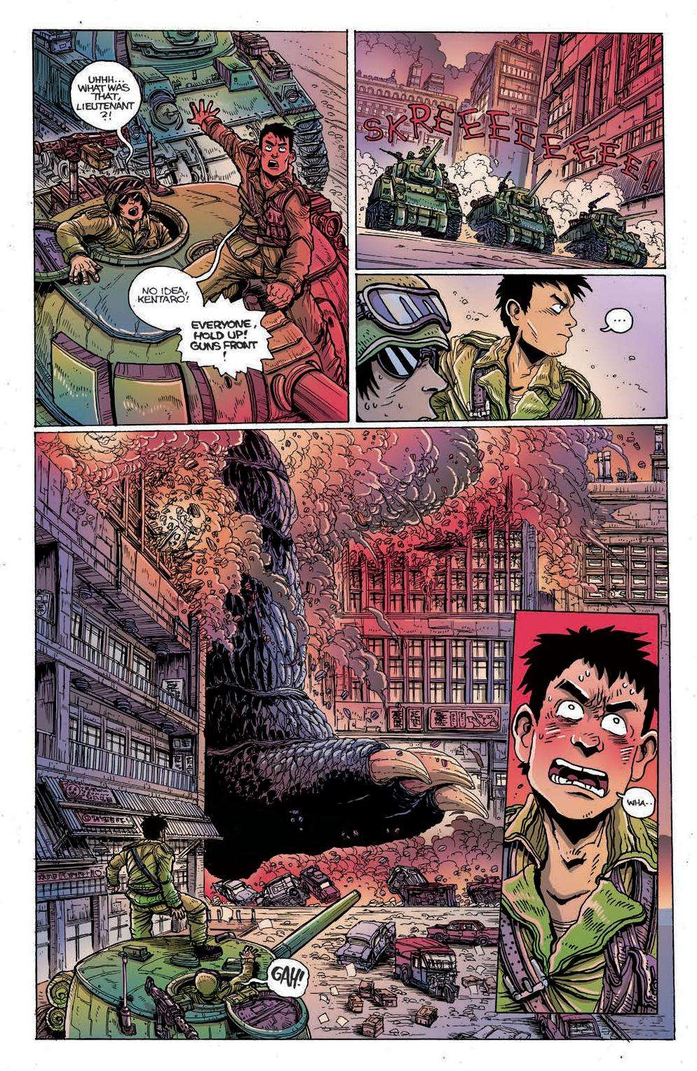 Issue 1 had story and art by James Stokoe, using a moody and almost surreal art style with a wide-eyed, expressive Final Wars-style Godzilla, fighting enemies out of John Carpenter’s The Thing. It was completely free of dialogue and initially made me concerned that the series would feel too experimental to gain a wider audience, though I was a massive fan of the art direction and mood.