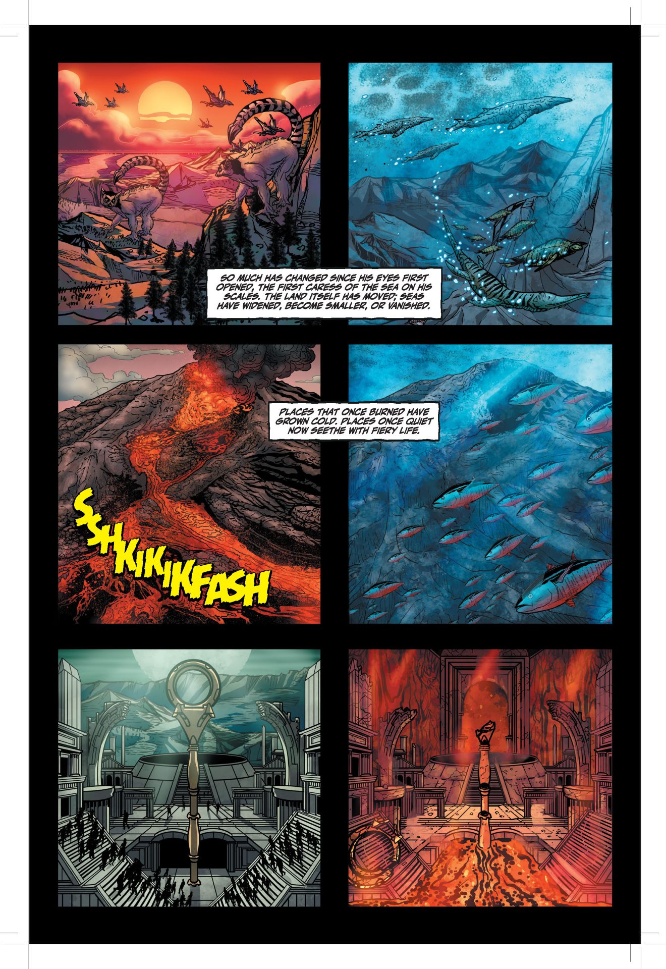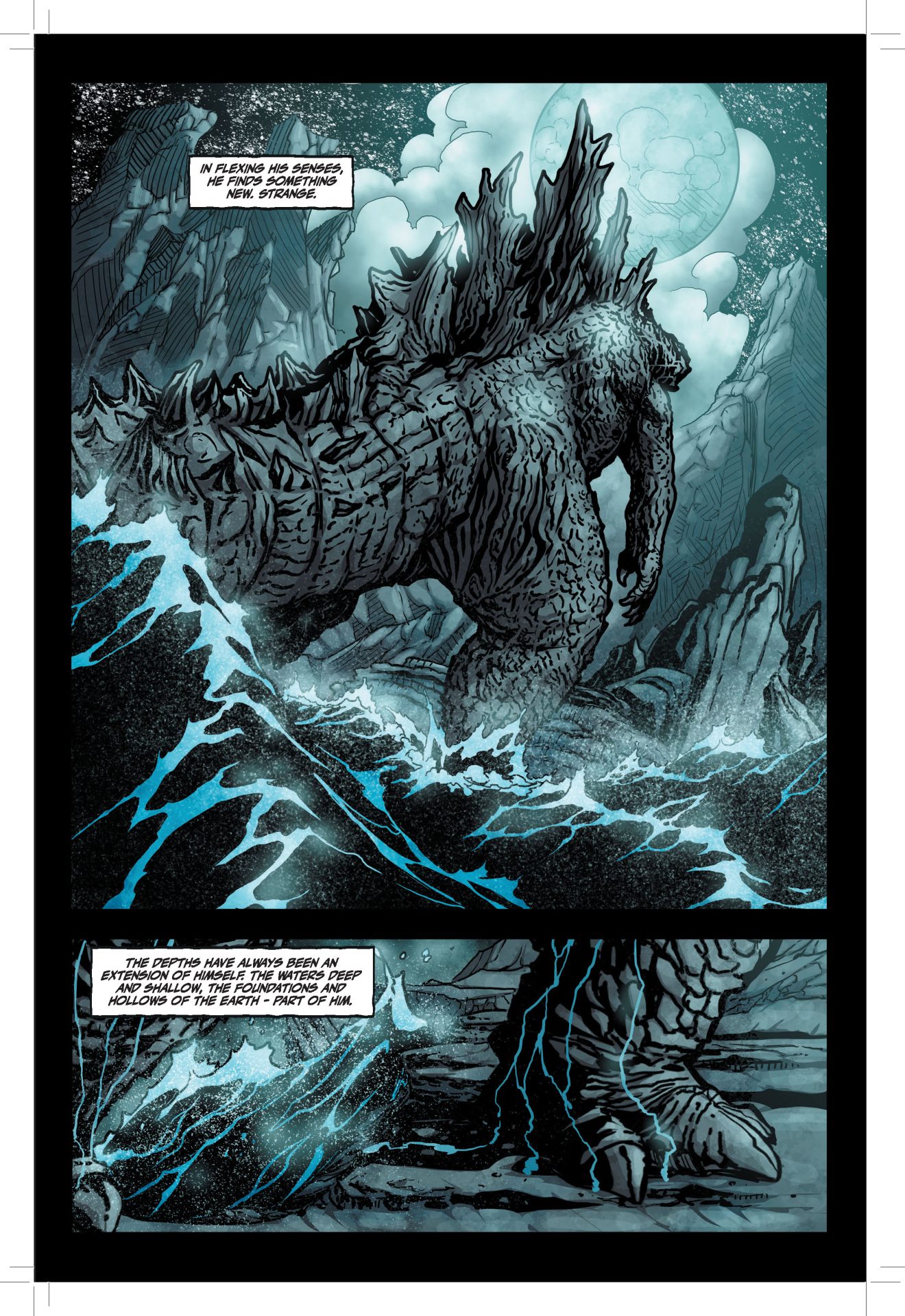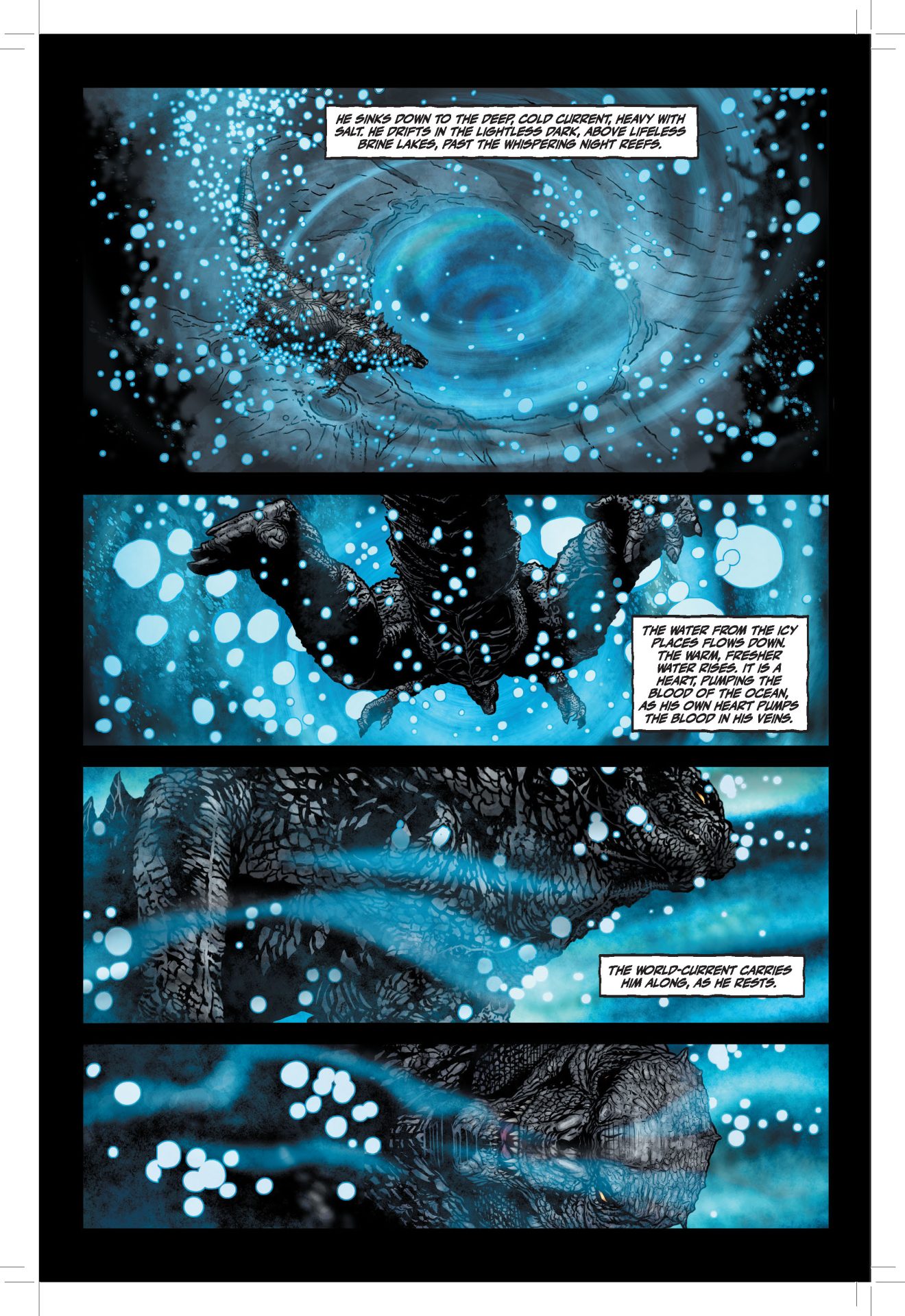 Artist Drew Edward Johnson draws Godzilla with a great sense of scale and scope, though I wish the depth of the ocean was communicated a little better. It always bugs me to see Godzilla swimming while completely immersed in water one minute and then suddenly standing in that same water moments later. Godzilla is expertly drawn, especially when he’s the only character in a panel. There are many full-page splashes and two-page spreads that truly showcase Godzilla’s elegant ferocity. Unfortunately, in many of the action scenes it is very hard to tell what is going on. Godzilla’s opponents and their actions become unclear, making it hard to follow the fight sequences. Unexpected changes in perspective between connected panels further confuse the imagery.