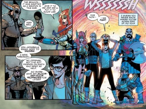 Unlike Journey into Mystery where many characters are lost in the shuffle or are catchphrase shouters, Bunn gives each member of the Asgardians of the Galaxy at least one small showcase moment. Executioner and Punisher get to compare guns, and Black Panther compliments Urzuul’s weapon craftsmanship. (Wow, that came out wrong.) Cap tells Thunderstrike that his dad was a great hero, and Angela gets to be very angry at the Angels of Heven for siding with Malekith. However, the characters who come across the best are Throg and Annabelle Riggs/Valkyrie.