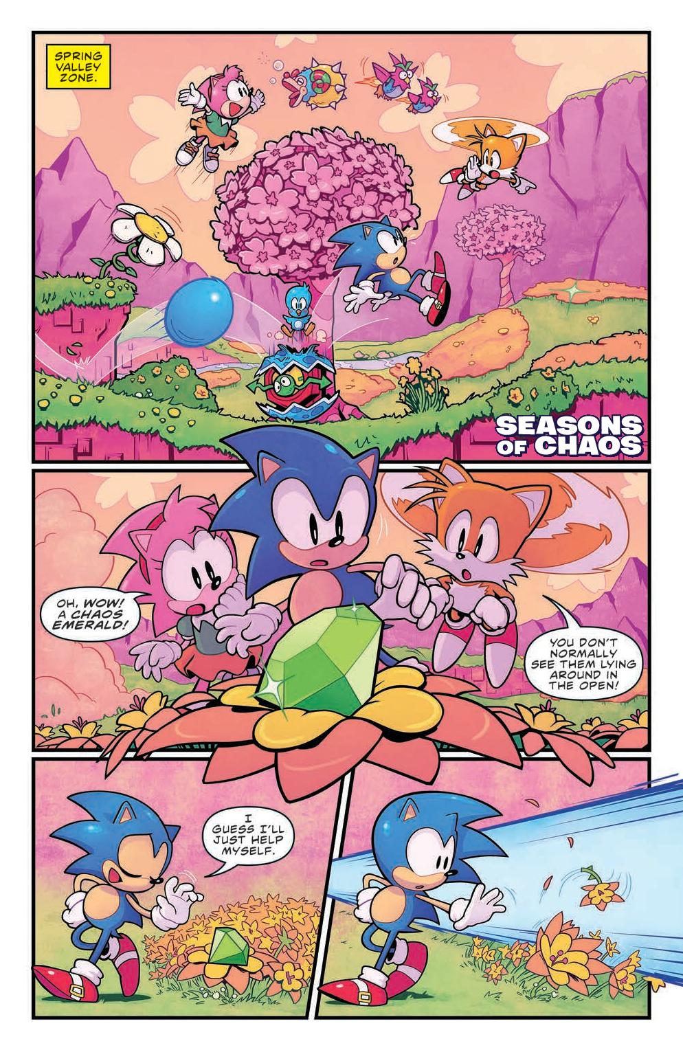 First, in “Seasons of Chaos” by longtime Sonic scribe Ian Flynn and artists Aaron Hammerstrom & Reggie Graham, Sonic goes on an adventure from pleasant spring valleys to wintry wonderlands in search of the Chaos Emeralds. But Sonic’s not alone, with a little help from his friends Miles “Tails” Prower, Knuckles the Echidna, Amy Rose, Mighty the Armadillo, and Ray the Flying Squirrel, they’ll race, fight, and fly their way to victory against the baddest of baddies!
