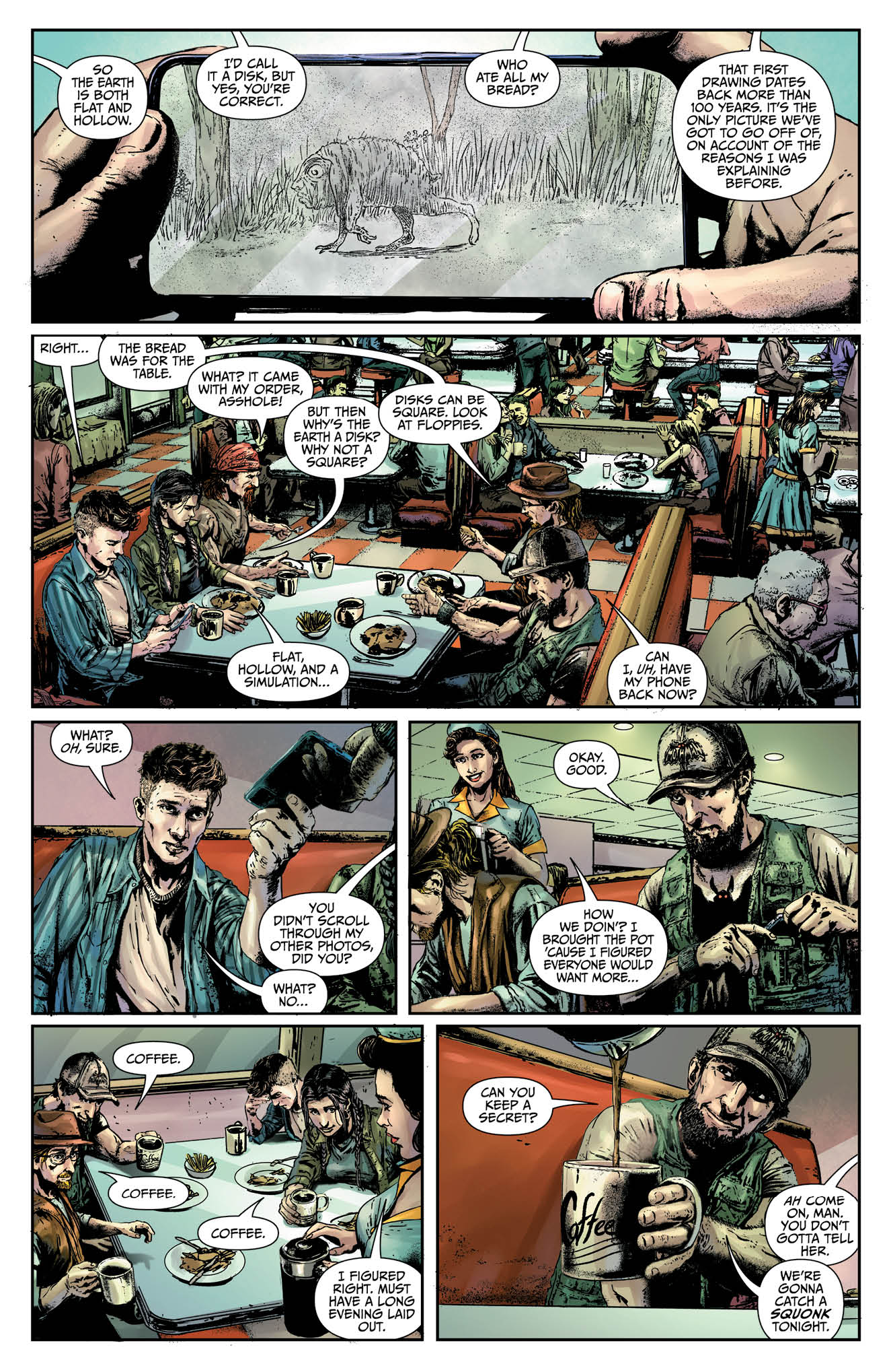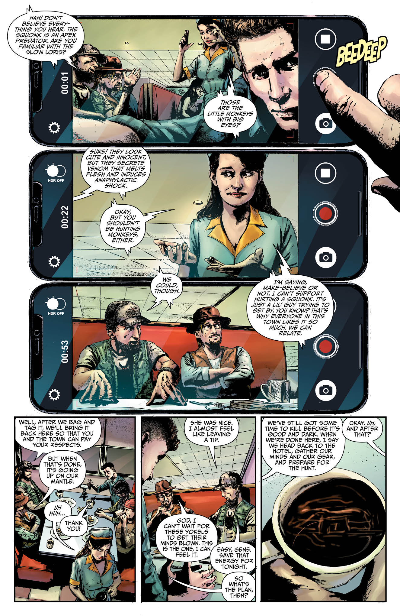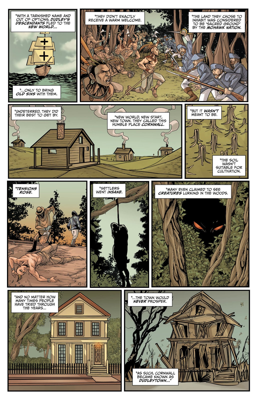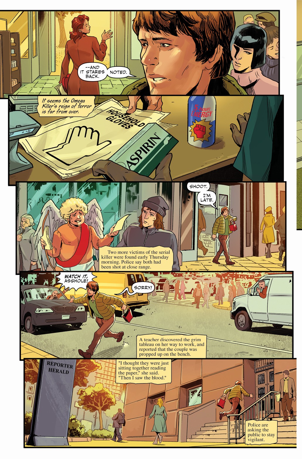 The first story has a lot of flashbacks, but artist Dario Tallarico and colorist Maxflan Araujo don’t do much to distinguish these scenes from those set in the present. The reader eventually catches on, but some sort of deviation of color would have helped make the change of setting much clearer. The second story looks much better than its predecessor. Oliver Borges uses perspective to great effect. He draws panels from varying angles, giving the story a cinematic look. Plus, the monster he gets to draw looks fearsome and badass.