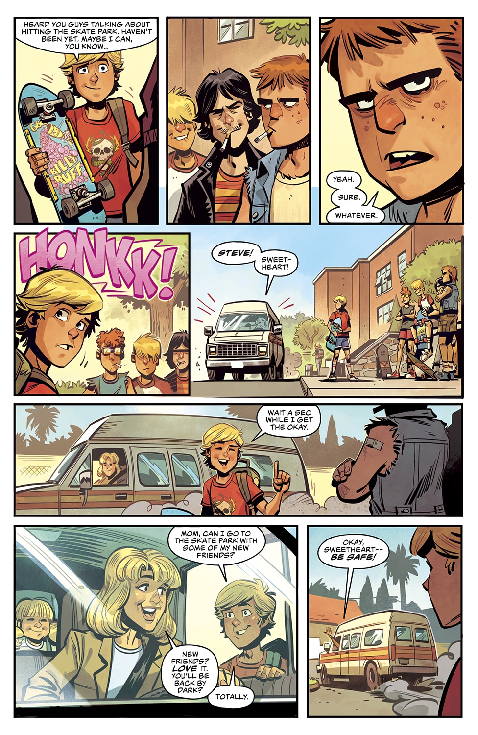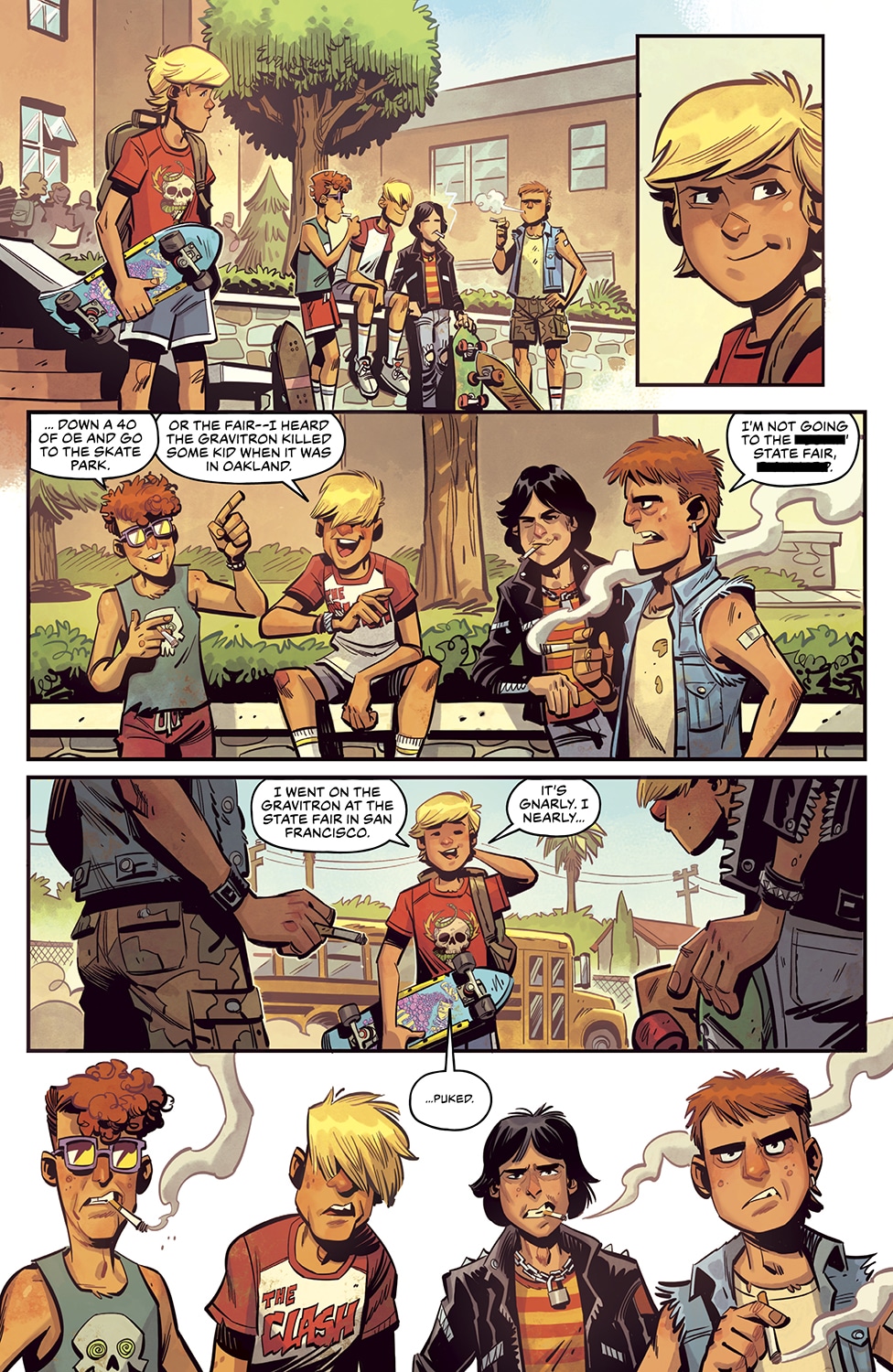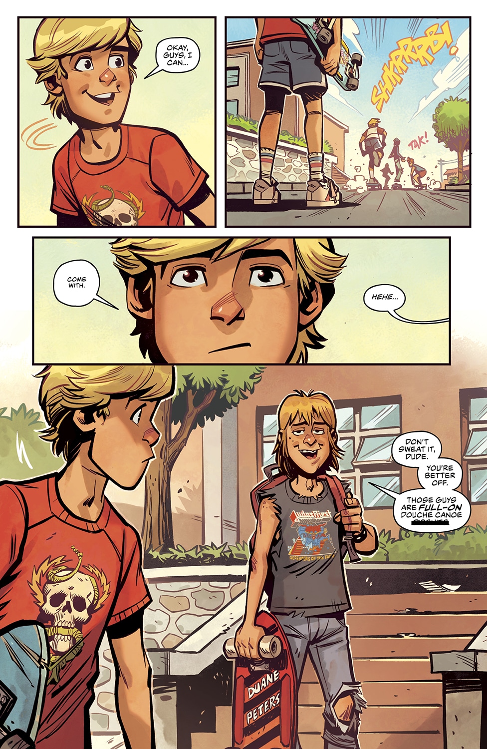 Like some of the best John Hughes movies, Grommets takes readers on an ’80s-infused journey of a young Rick starts a new school and tries desperately to find his place amongst the cliques of foul-mouthed high schoolers of the Sacramento suburbs. Skateboarding provides him with an opportunity to make some ‘cool’ new friends—but he soon finds out that they may not be as ‘cool’ as he (or they!) first thought.
