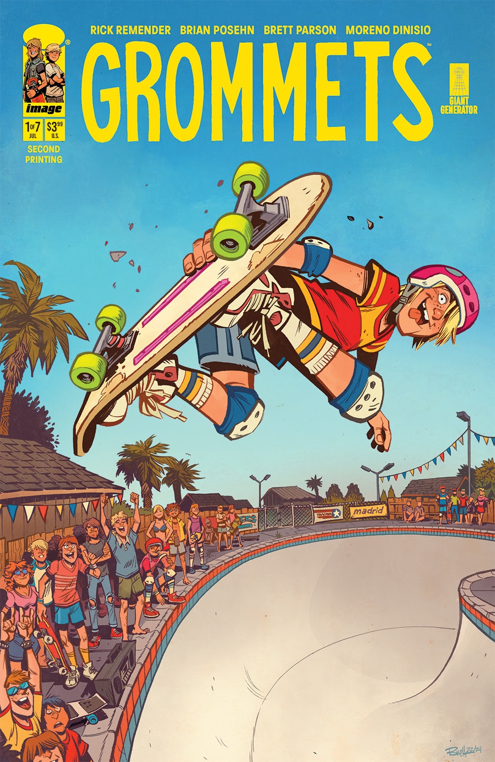 Writer Rick Remender and comedian and writer Brian Posehn alongside artistic powerhouse Brett Parson and colorist extraordinaire Moreno Dinisio have a kickflip hit on their hands with last week’s buzzy debut of Grommets #1. This seven issue miniseries from Image Comics has instantly charmed readers with its slice-of-life, coming-of-age story and is being rushed back to print this week in order to keep up with escalating demand.