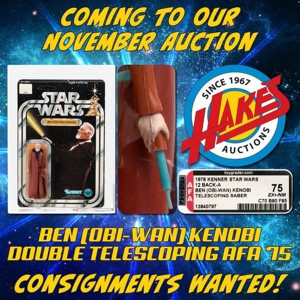 From October 6-9, a variety of Video Game Authority (VGA)-graded video games will be at booth #3063 as part of a sneak preview of the next Hake’s auction. Also on display will be a Ben (Obi-Wan) Kenobi Double-Telescoping figure, graded 75 EX+/NM by the Action Figure Authority (AFA), as well as some key comic books from the auction. Hake’s Auction #236 goes online October 25, 2022 and closes November 15-16, 2022.