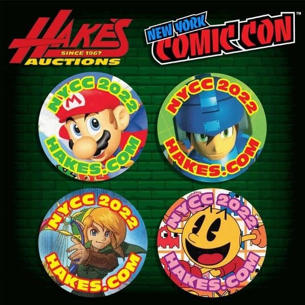 In addition, Hake’s will be giving out four specially designed pin-back buttons at the booth, featuring an assortment of popular video game characters. A different button will be available each day of the convention, all exclusive to NYCC 2022.