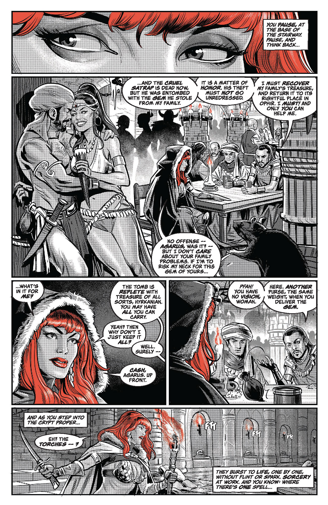 As a special bonus, this 40-page one-shot also includes a reprint of KURT BUSIEK and BENJAMIN DEWEY’s “Seeing Red” from the pages of Red Sonja: Black, White, Red, which finds the She-Devil with a Sword seeking a precious, priceless item in the foreboding Mountains of Night!