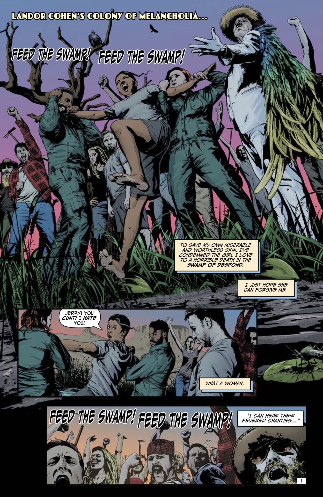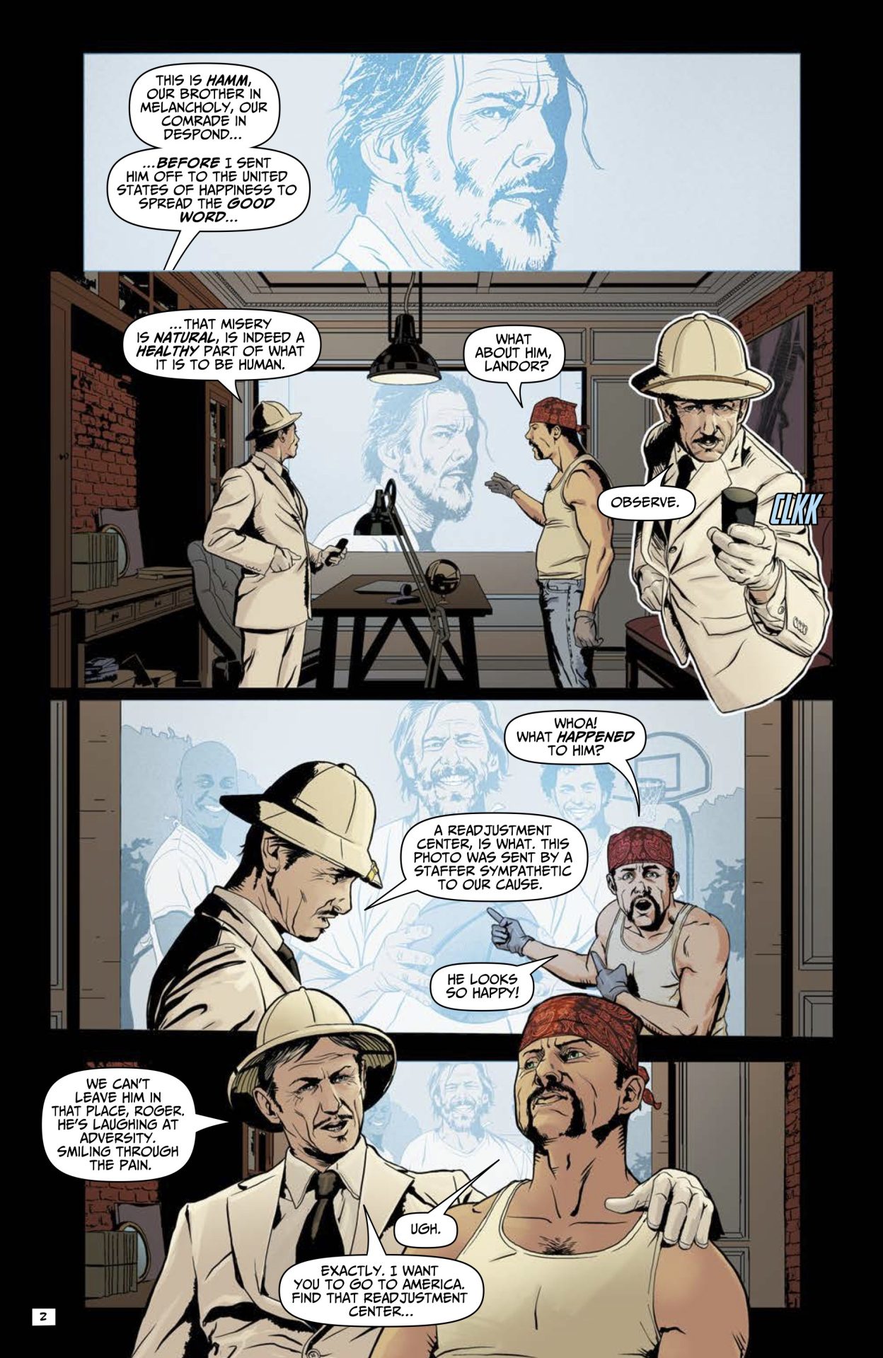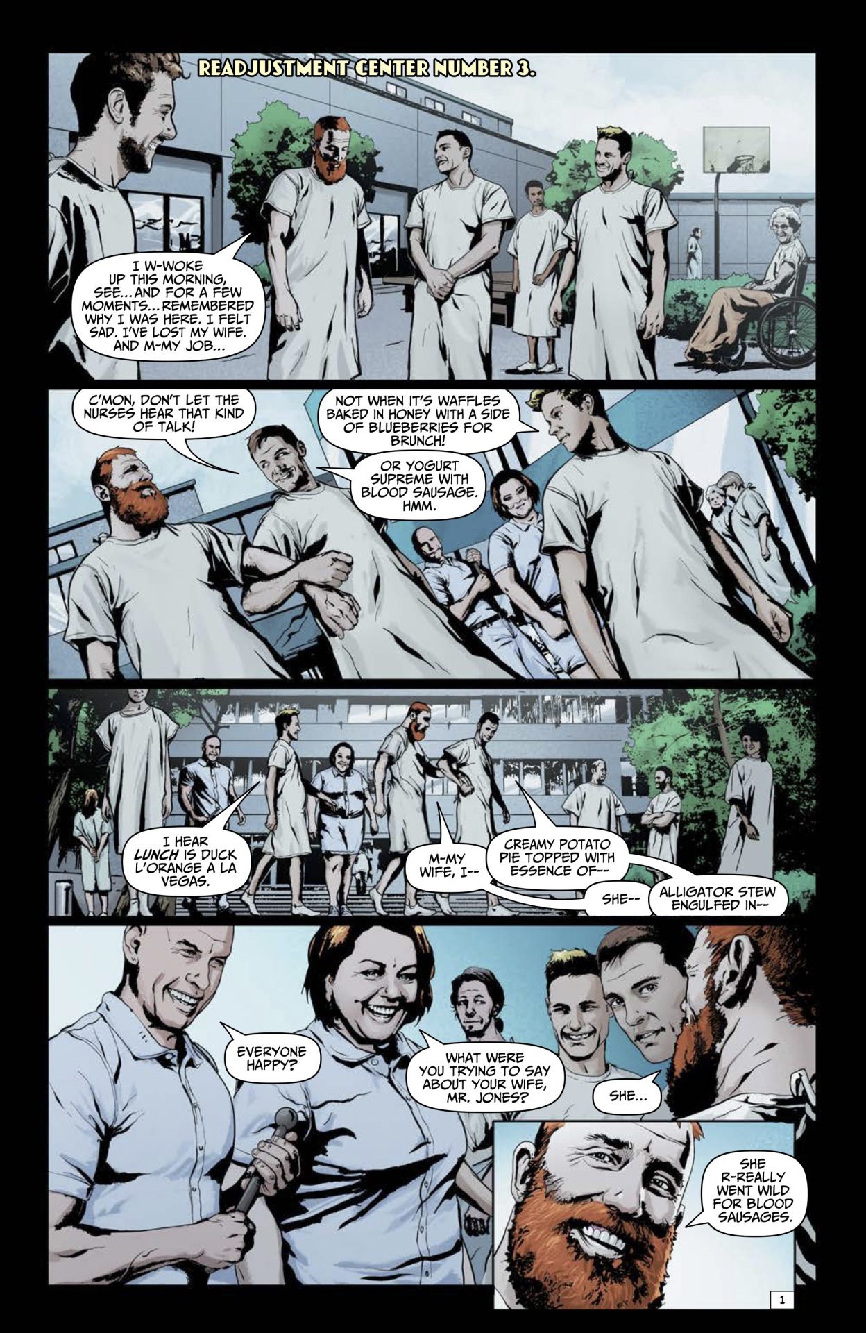 Writer Peter Milligan, artist Michael Montenat, and colorist Felipe Sobreiro create a high concept dystopian comic in Happy Hour #1. The book’s premise is that being unhappy is a crime and gets you thrown in A Clockwork Orange-style re-education camps (But with better food) where you’re basically tortured into having a Joker smile even when you feel pain, discomfort, or in a state of emotional distress or grief. For example, one of the main characters, Jerry, is thrown into a re-education camp by the Joy Police because he’s sad that his sister has passed away while his mind-screwed mom and the doctor are laughing and making jokes about her looks. This is bad, but one of his fellow inmates at the camp, a bit of a wildcard named Hamm, keeps talking about Landor Cohen, who has a “paradise” in Mexico where anyone can be as miserable as they want. However, in keeping with Happy Hour‘s cynical tone and Milligan’s self-aware writing style, this isn’t as it seems.