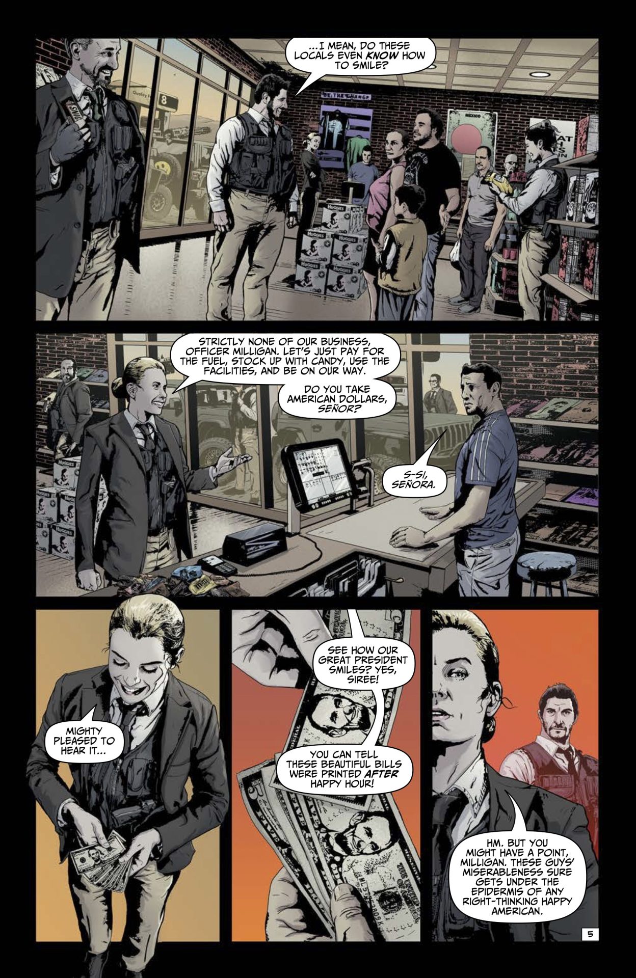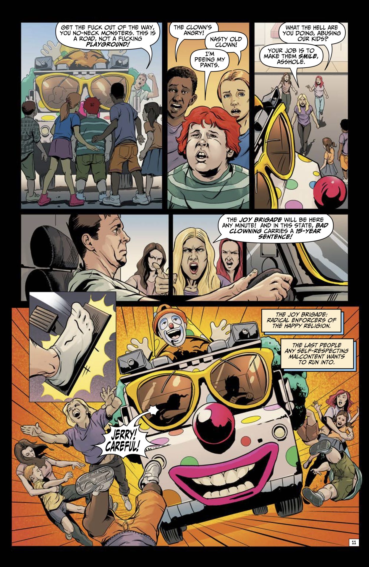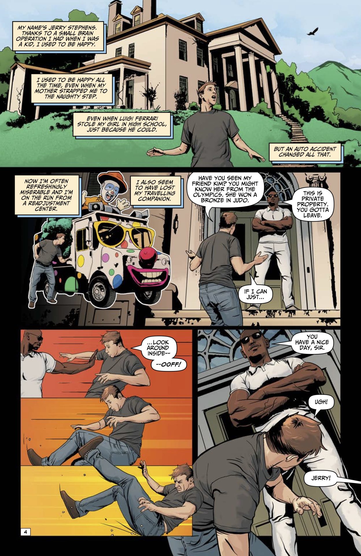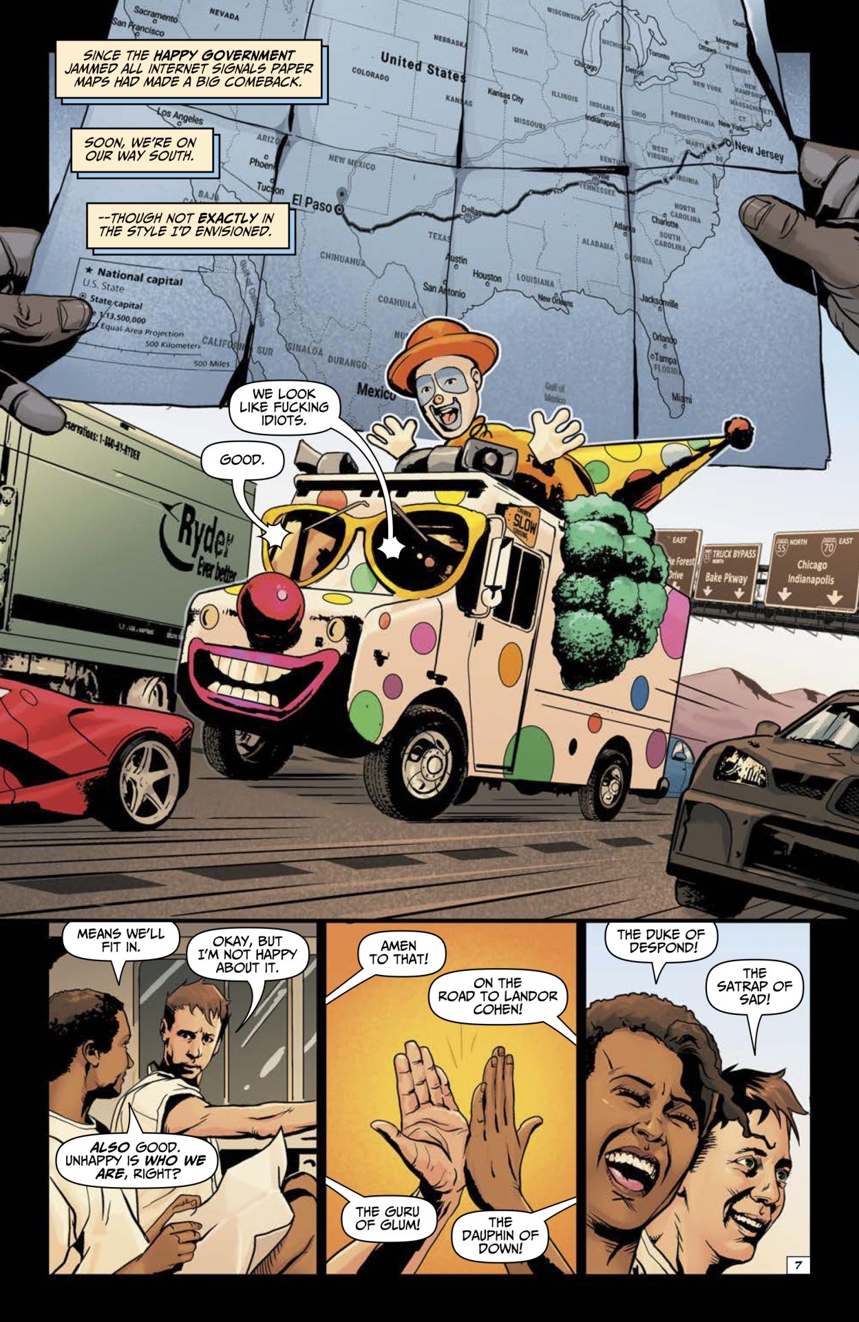 Writer Peter Milligan, artist Michael Montenat, and colorist Felipe Sobreiro create a high concept dystopian comic in Happy Hour #1. The book’s premise is that being unhappy is a crime and gets you thrown in A Clockwork Orange-style re-education camps (But with better food) where you’re basically tortured into having a Joker smile even when you feel pain, discomfort, or in a state of emotional distress or grief. For example, one of the main characters, Jerry, is thrown into a re-education camp by the Joy Police because he’s sad that his sister has passed away while his mind-screwed mom and the doctor are laughing and making jokes about her looks. This is bad, but one of his fellow inmates at the camp, a bit of a wildcard named Hamm, keeps talking about Landor Cohen, who has a “paradise” in Mexico where anyone can be as miserable as they want. However, in keeping with Happy Hour‘s cynical tone and Milligan’s self-aware writing style, this isn’t as it seems.